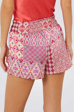 מכנסי פיג'מה קצרים מסאטן מבית המותג הצרפתי ETAM, בגזרה רחבה עם גומי בקו מותניים והדפס מגוון בצבע ורוד.