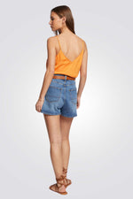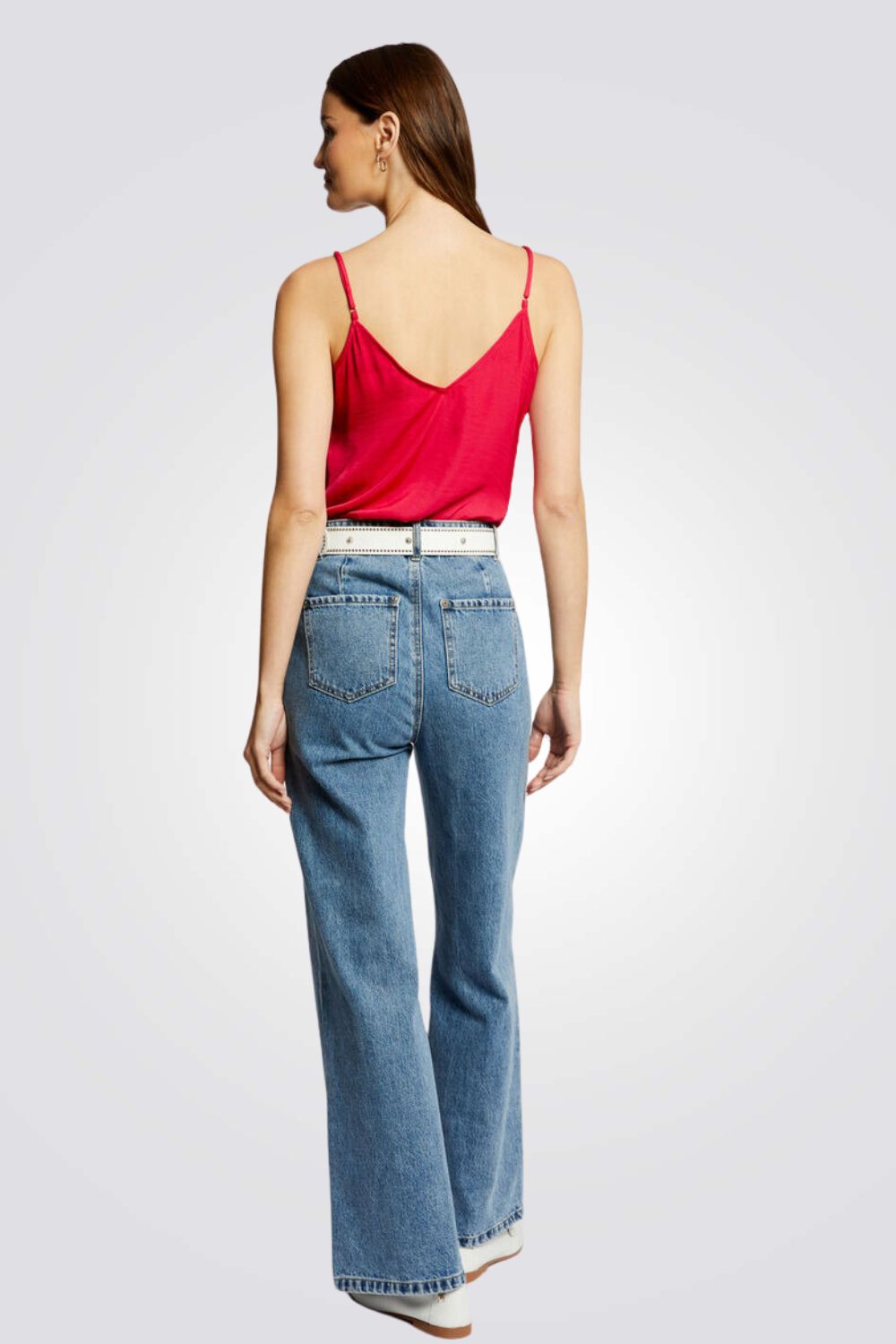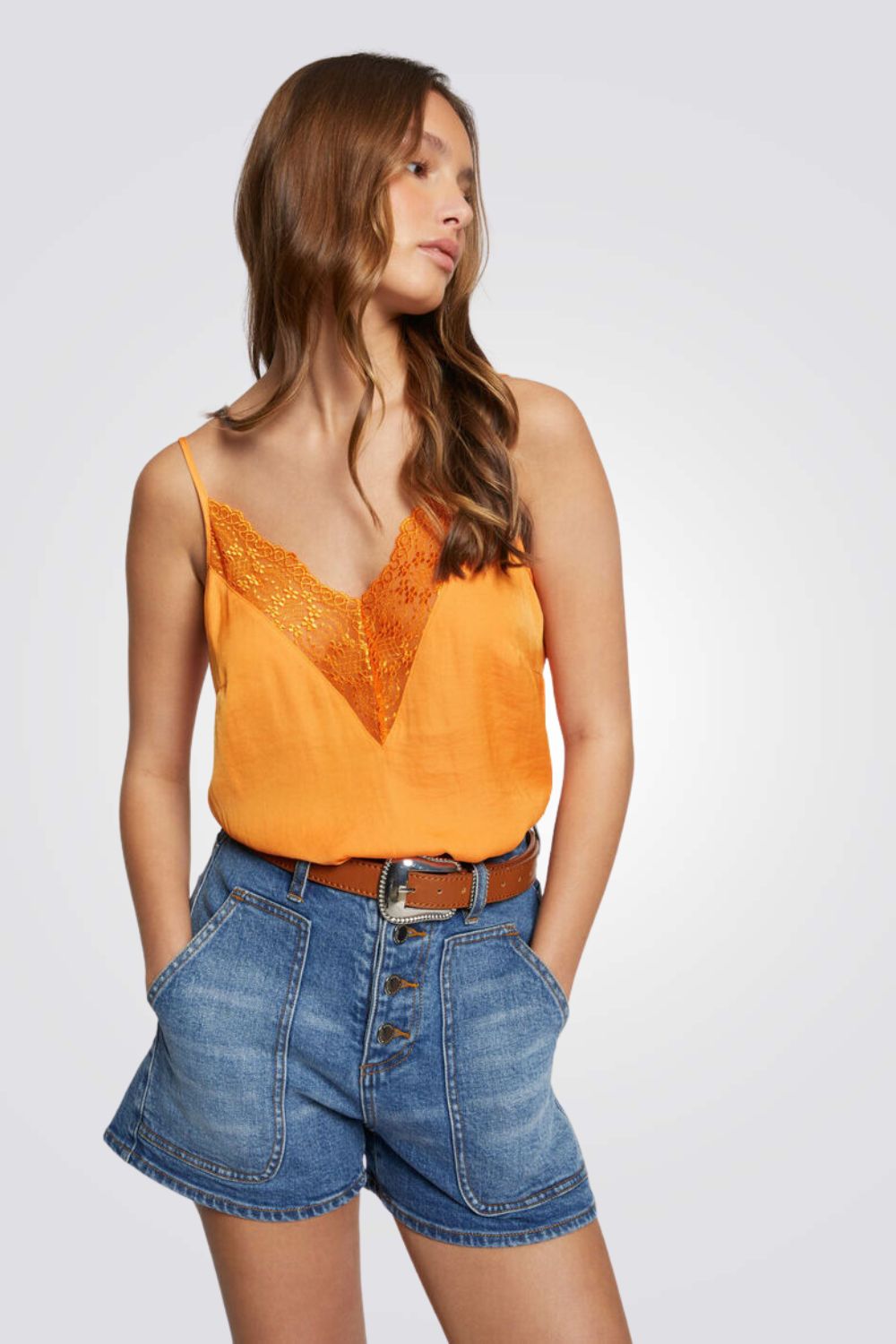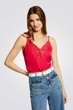 גופיית סאטן מבית המותג MORGAN בעל מחשוף V עמוד עם עיטורי תחרה, רצועות דקות ומתכווננות לנוחות מקסימלית.