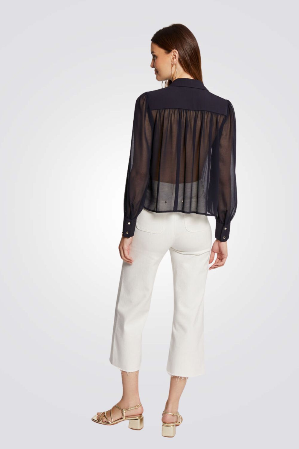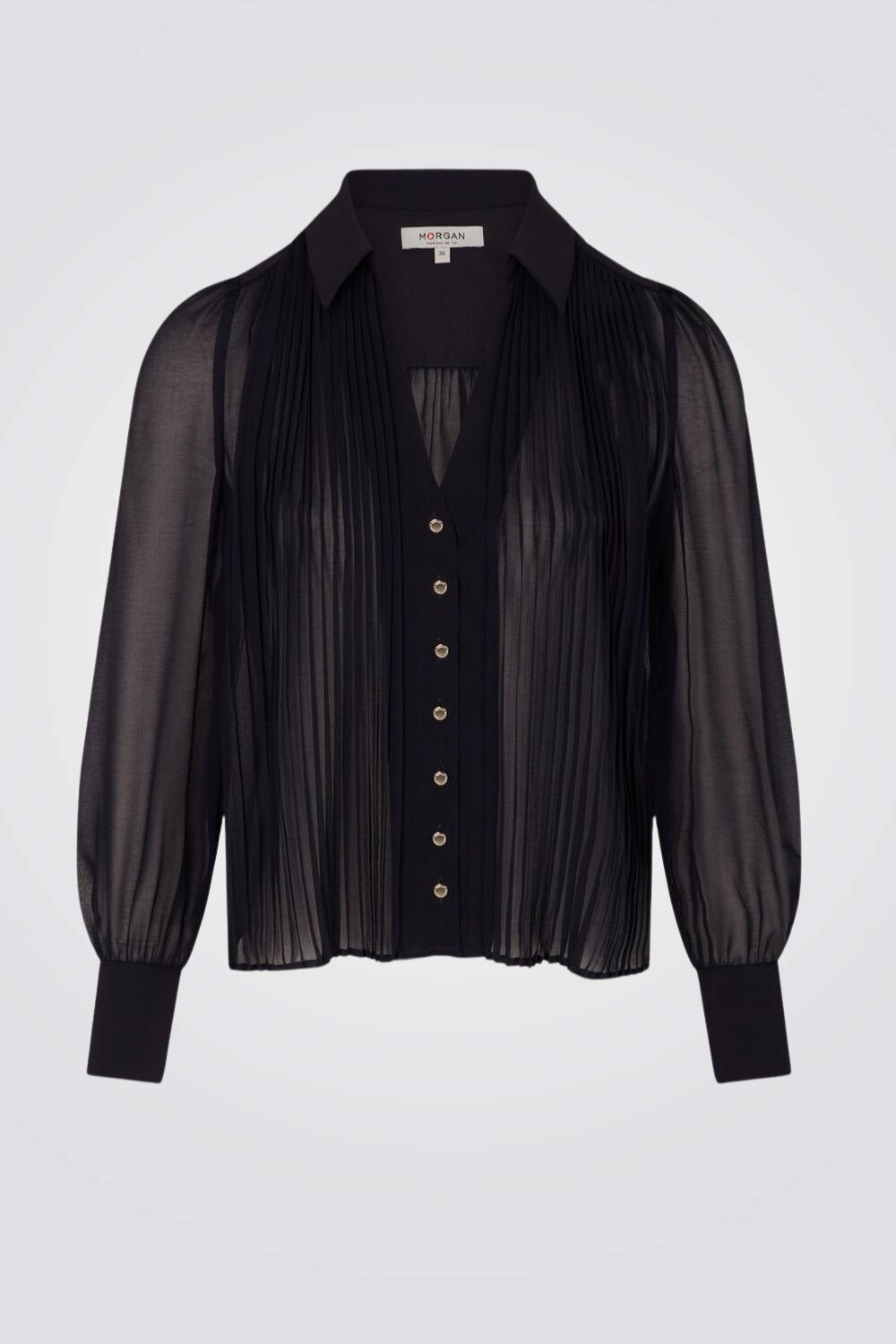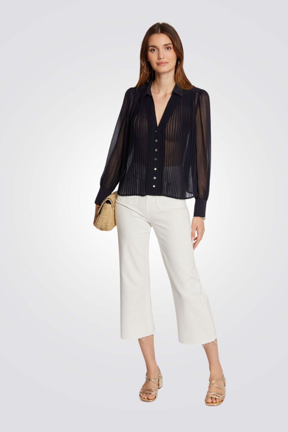 חולצת פליסה מכופתרת מבית המותג MORGAN בצבע נייבי, מעט שקפקפה עם שרוולים ארוכים וצווארון וי עמוק.