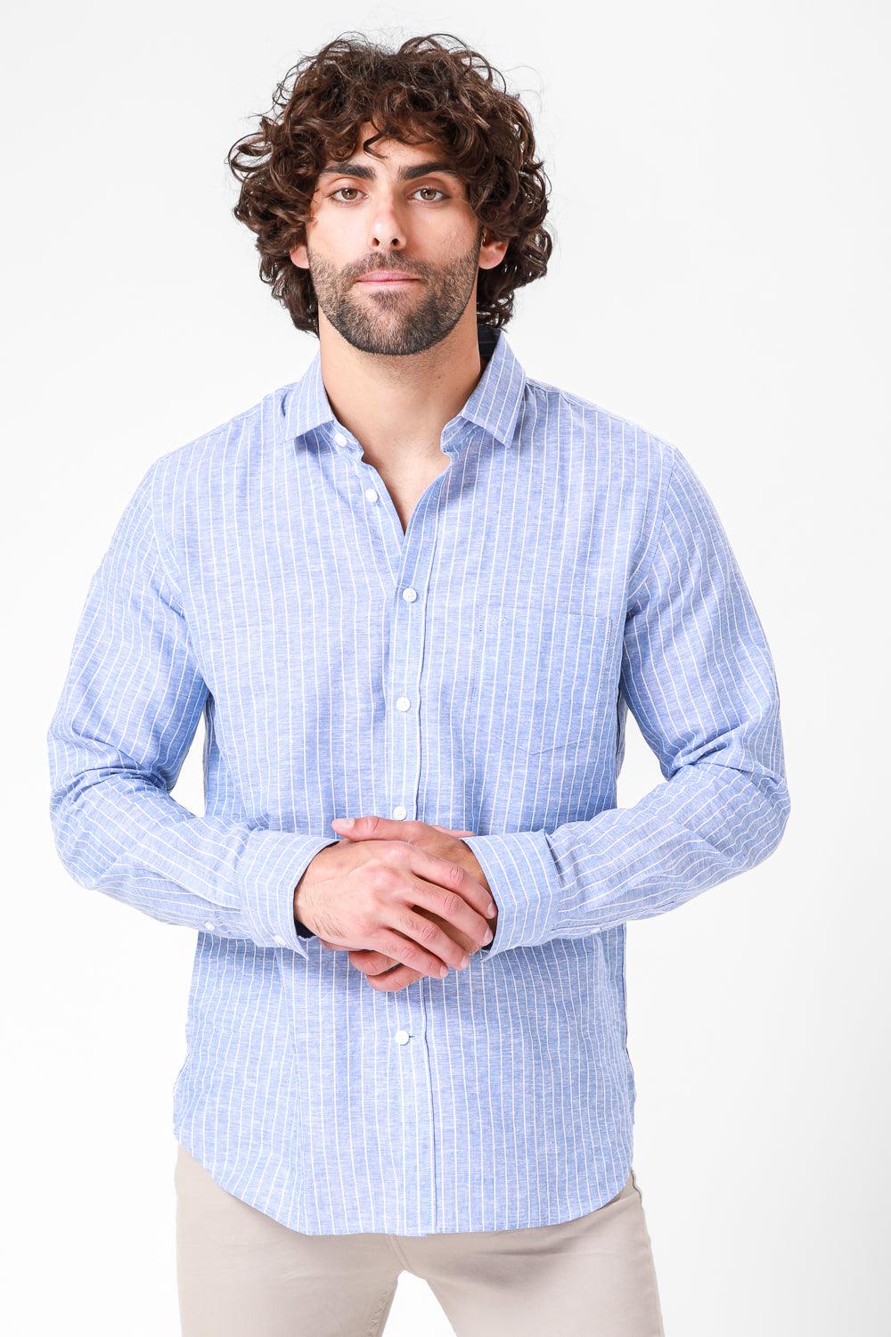 מכופתרת כחולה עם פסים דקים בצבע לבן