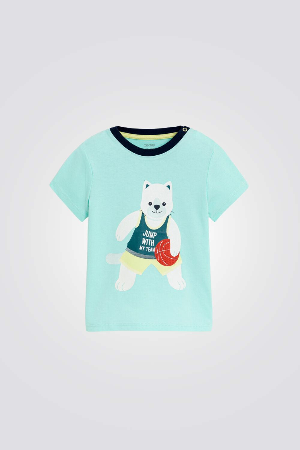 טישירט לתינוקות מבית המותג OBAIBI , בצבע תכלת עם הדפס , עשוי מבד רך , עם צווארון עגול ושרוולים קצרים וסגירת כפתורים בכתף .