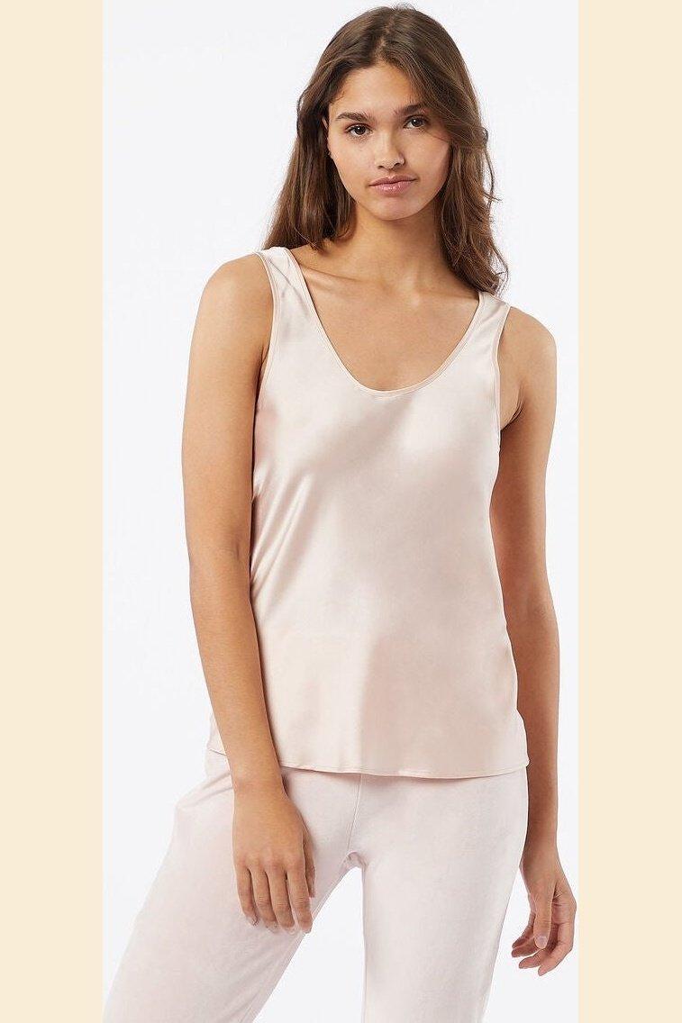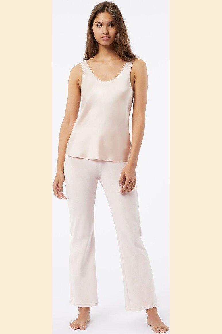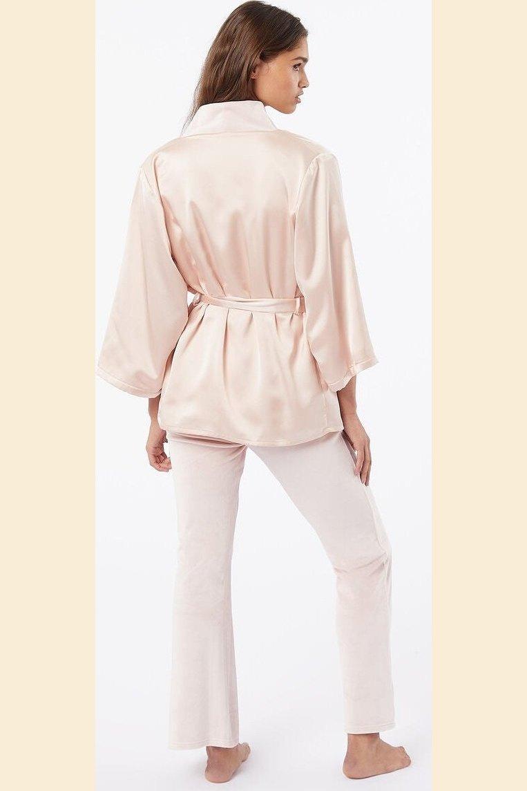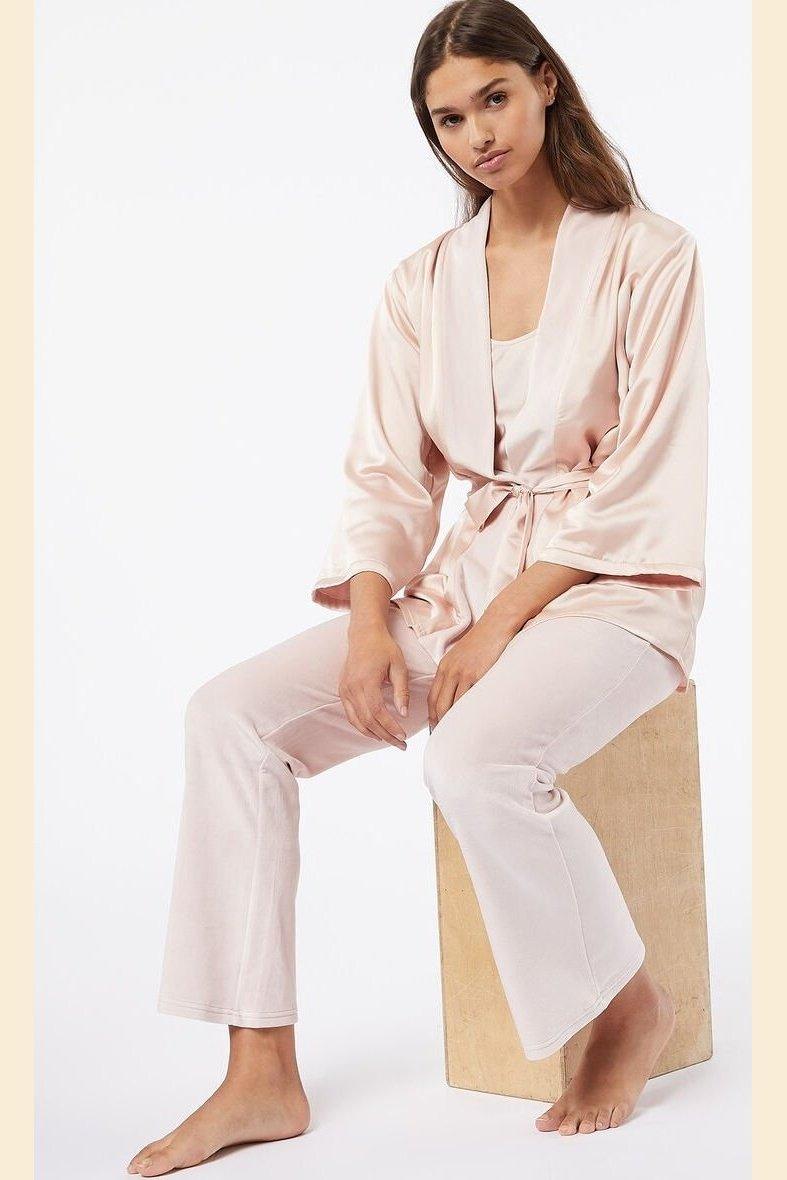 חליפת בית של המותג הצרפתי ETAM הכוללת שלושה חלקים: גופייה מבד סאטן דק ונעים בגוון ורוד פודרה עם מפתח צוואר עגול וכתפיות רחבות. מכנסיים קטיפתיים בגזרה מתרחבת. וחלוק קימונו סאטן בגימור קטיפתי, באורך קצר עם שרוולים ארוכים ורחבים וחגורת מותן תואמת הניתנת להסרה.