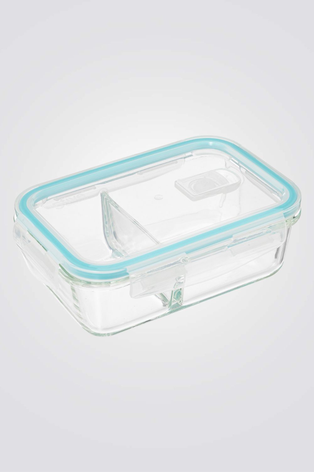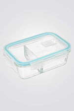 קופסת אחסון מלבנית מזכוכית מחולקת ל-2 תאים, בעלת מכסה עם מסגרת סיליקון לאיטום מפני נוזלים.