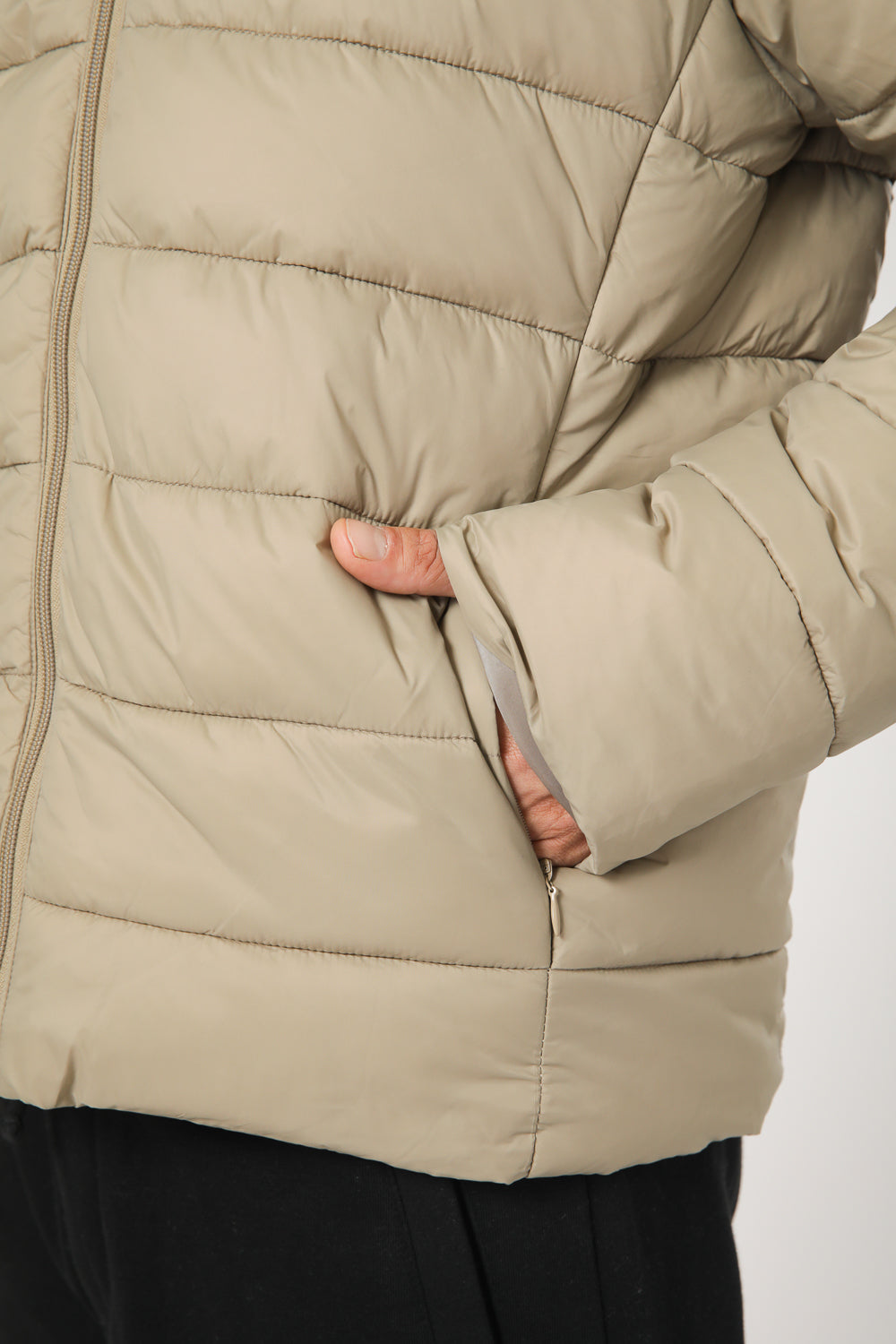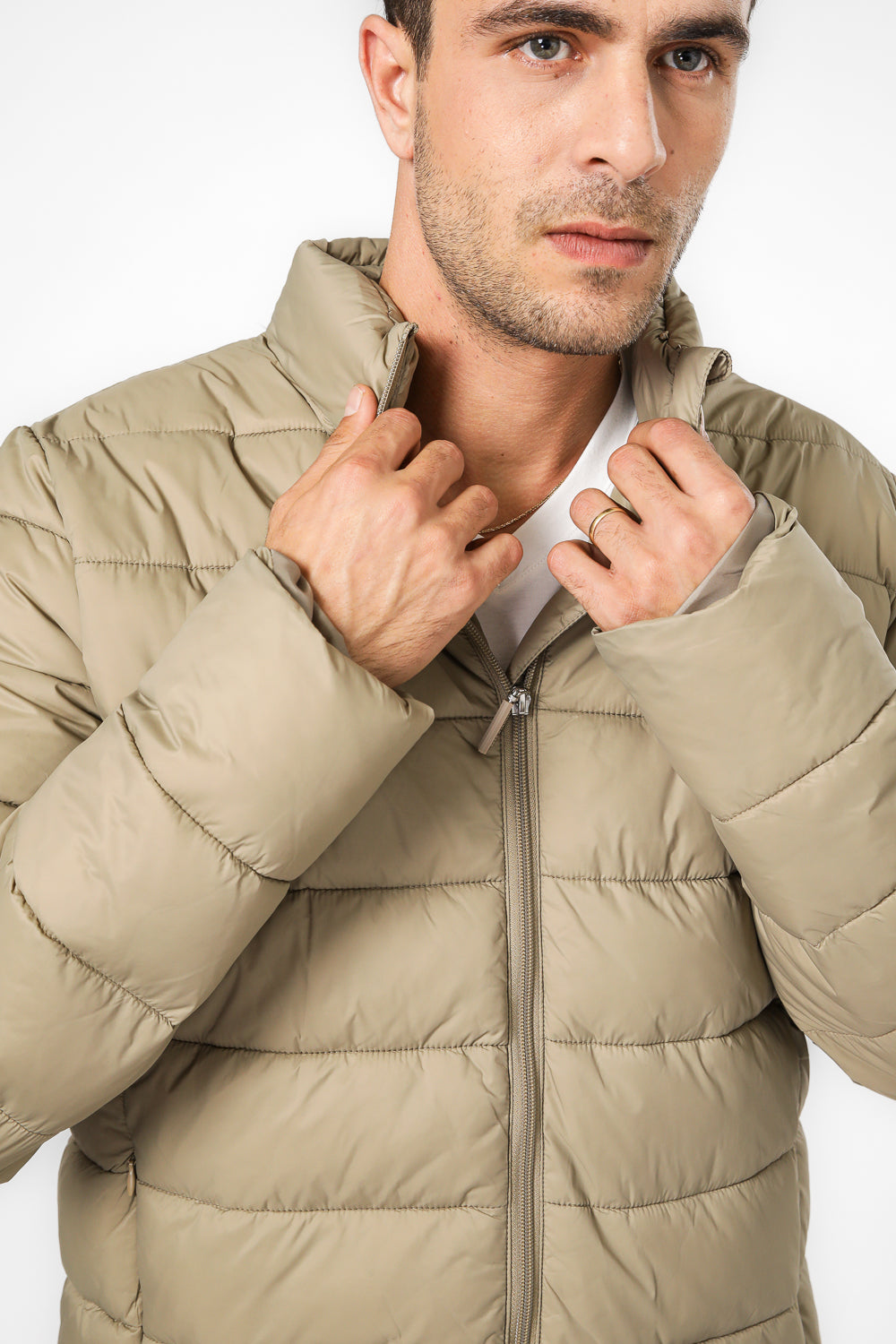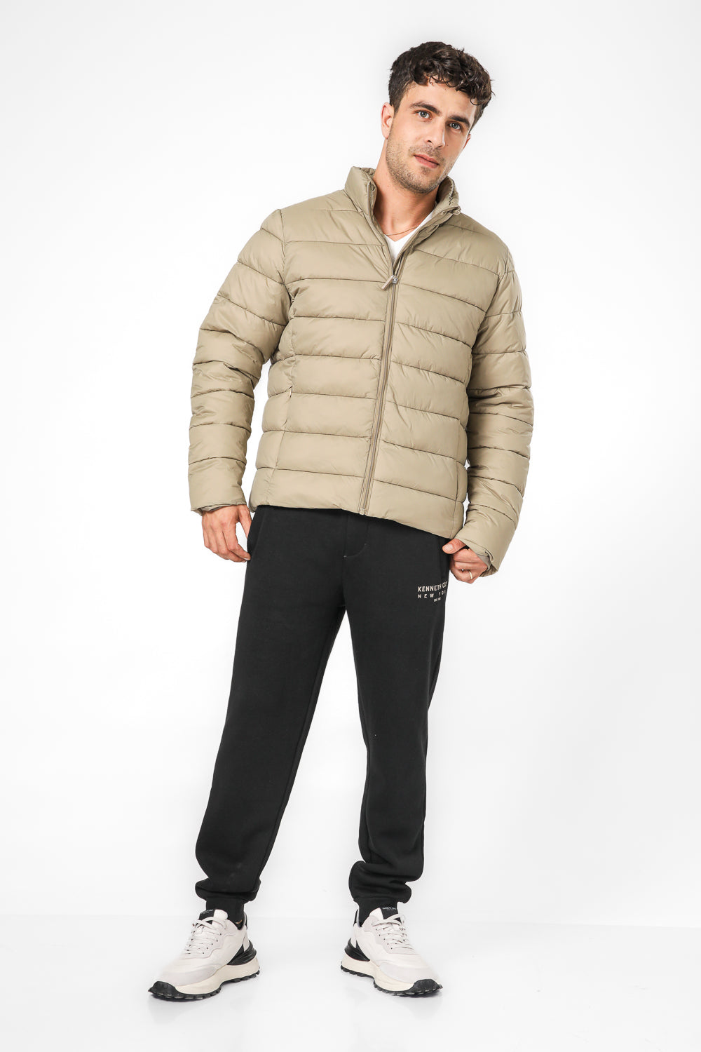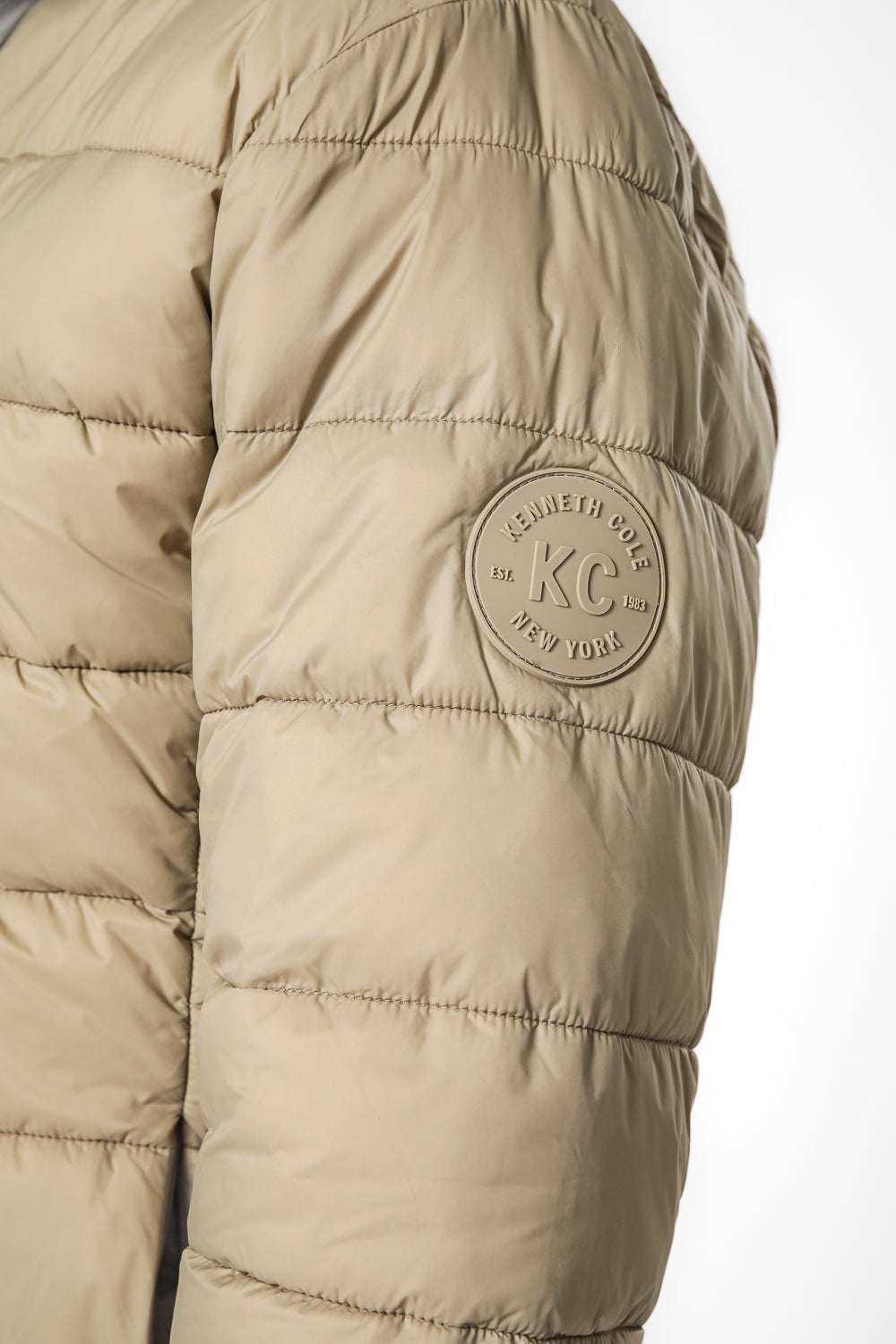 מעיל מרופד לגברים מבית KENNETH COLE בצבע כאמל, בעל כיסים קדמיים, צווארון גבוה וסגירת רוכסן מלאה.