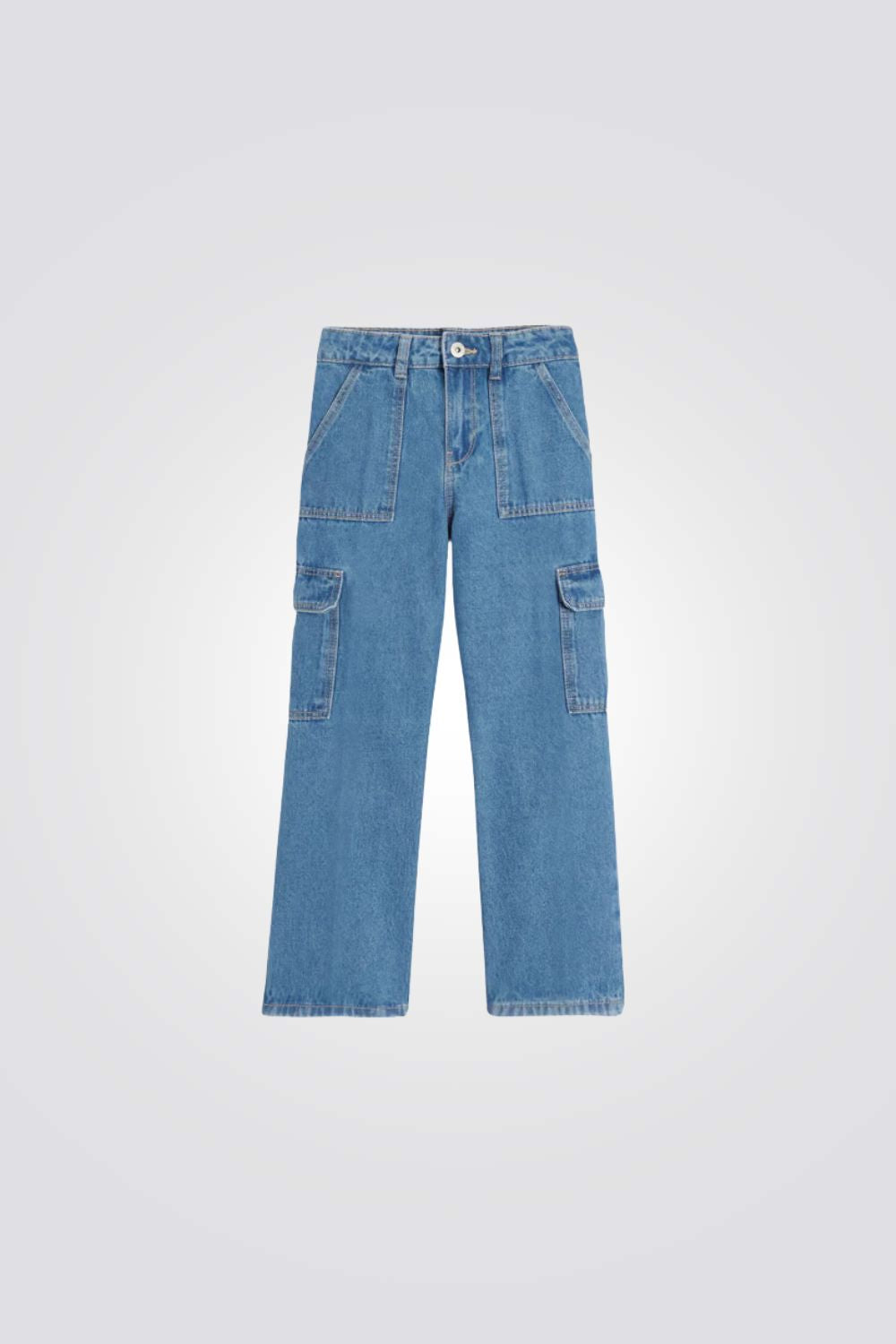 מכנסי דגמח ג'ינס לילדות מבית המותג OKAIDI, בצבע כחול, בגזרה ישרה , מותניים מתכווננות , סגירת רוכסן וכפתור, ושישה כיסים.