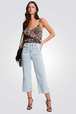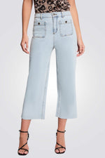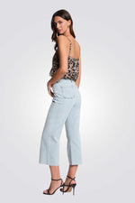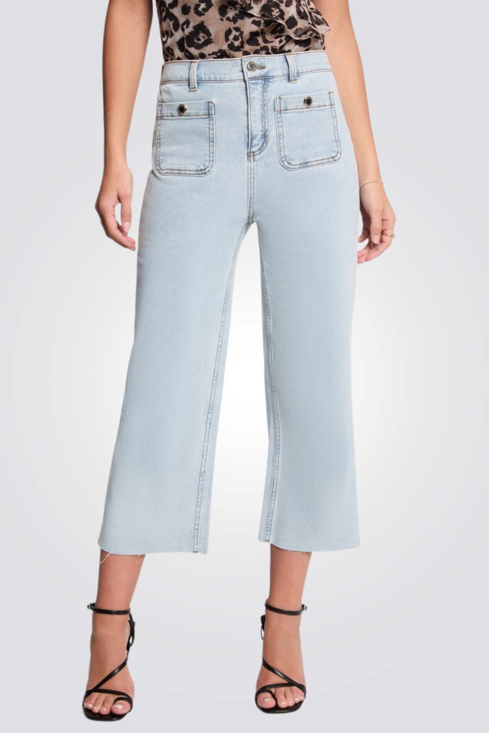 מכנסי ג'ינס לנשים מבית המותג MORGAN, בגזרה מתרחבת עם סיומת רחבה ומשוחררת באורך הקרסול, בגוון תכלת בהיר, מותן גבוהה ומחמיאה סגירת רוכסן וכפתור וכיסים קדמיים שמוסיפים טאץ' אופנתי.