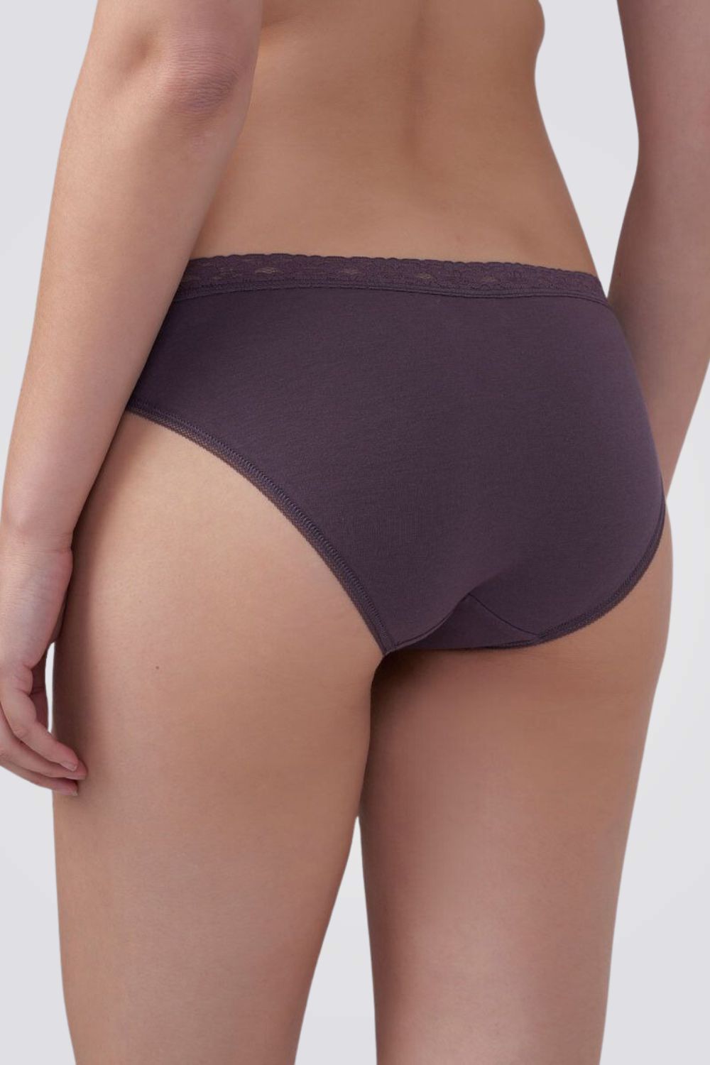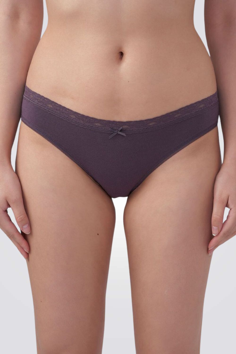 תחתוני ביקיני מבית המותג FEMINA לנשים בצבע חום כהה, בגזרה קלאסית, עשויים מבד לייקרה רך ונעים למגע, מעוטרים בפס תחרה פרחונית עדינה המוסיפה טאץ' נשי ואלגנטי עם פפיון קטן ומעודן במרכז.