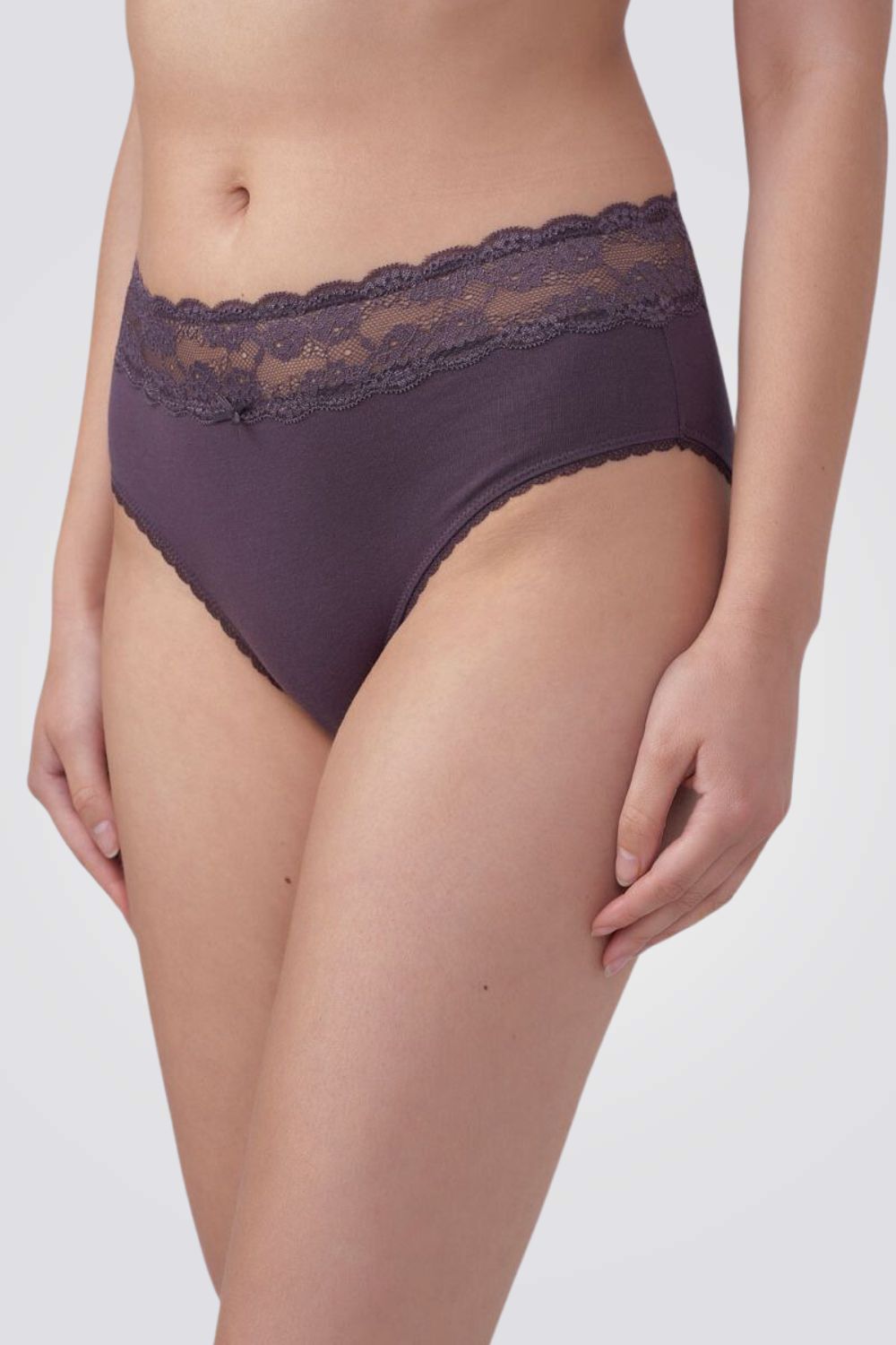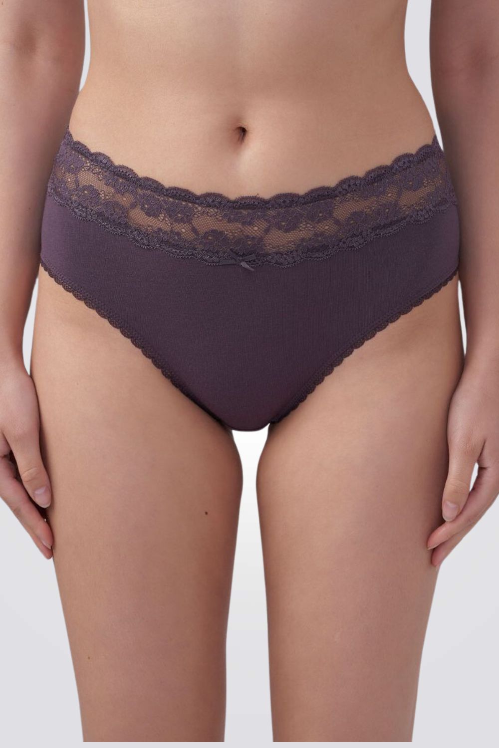 תחתוני מידי מבית המותג FEMINA לנשים בצבע חום כהה, עשויים מבד לייקרה רך ונעים למגע, בעיצוב אלגנטי עם פס תחרה פרחונית ותוספת פפיון קטן במרכז למראה נשי ומעודן.