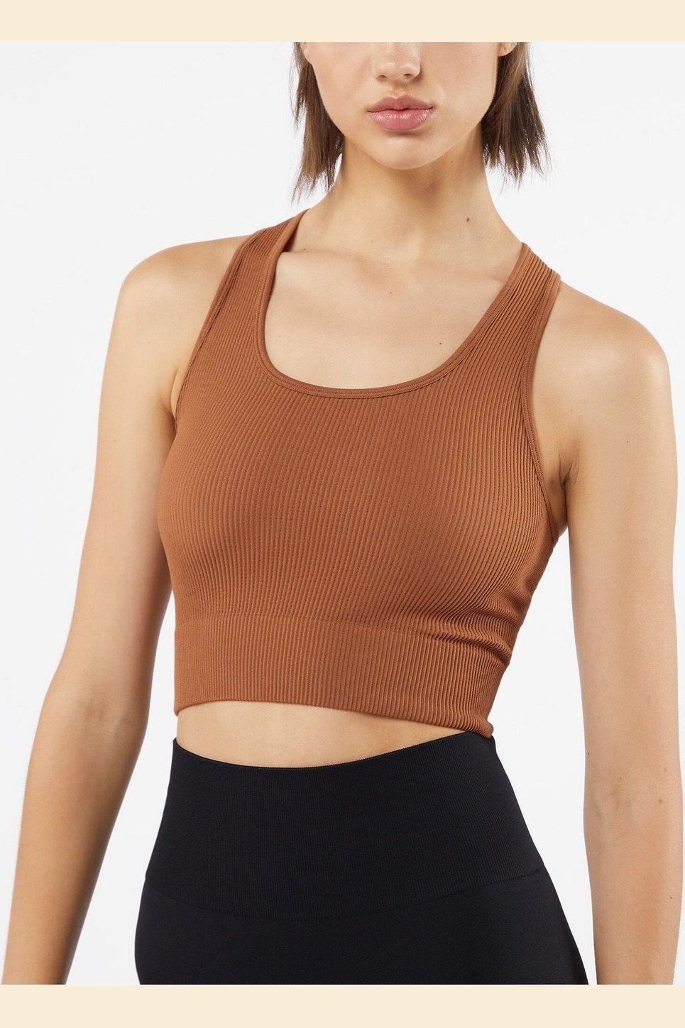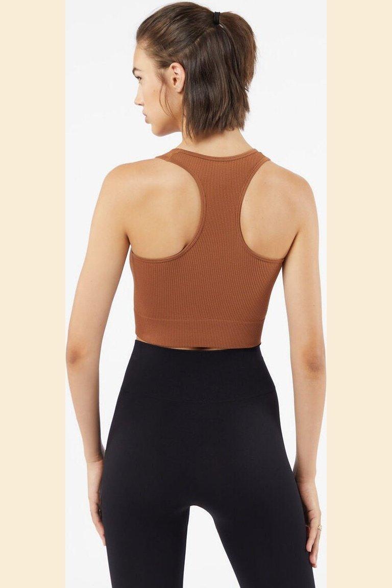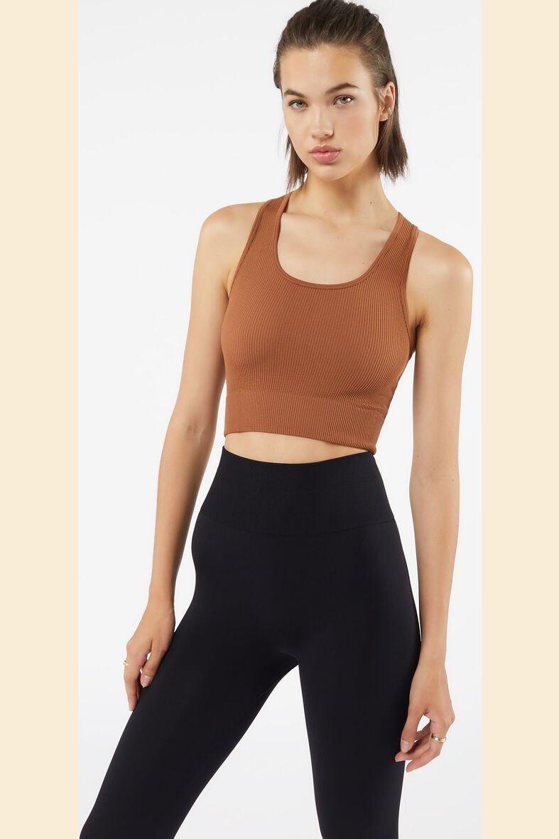 טופ ספורטיבי מבית המותג הצרפתי ETAM עם מחשוף עגול וגב במפתח רייסר, ארוג בדוגמת פסי ריב בטכנולוגיית סימלס - ללא תפרים לנוחות מקסימלית וחופש תנועה.