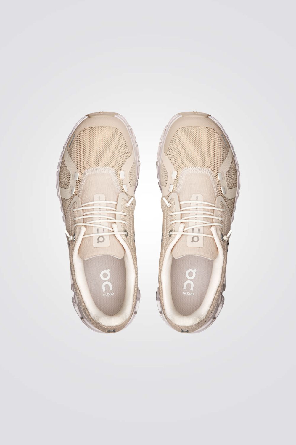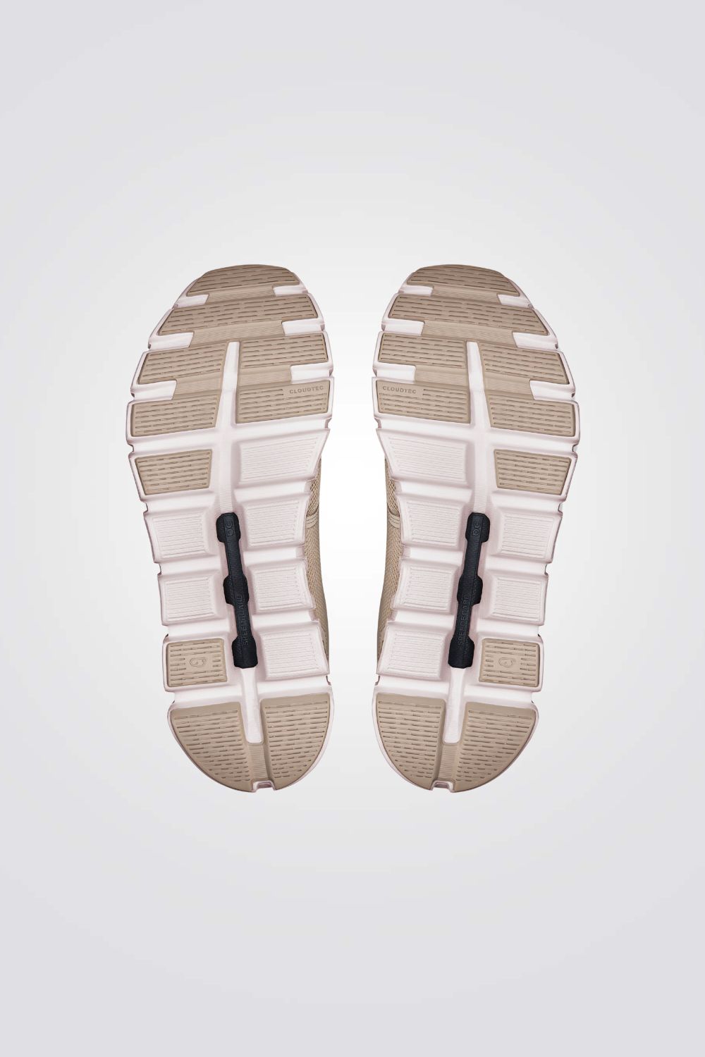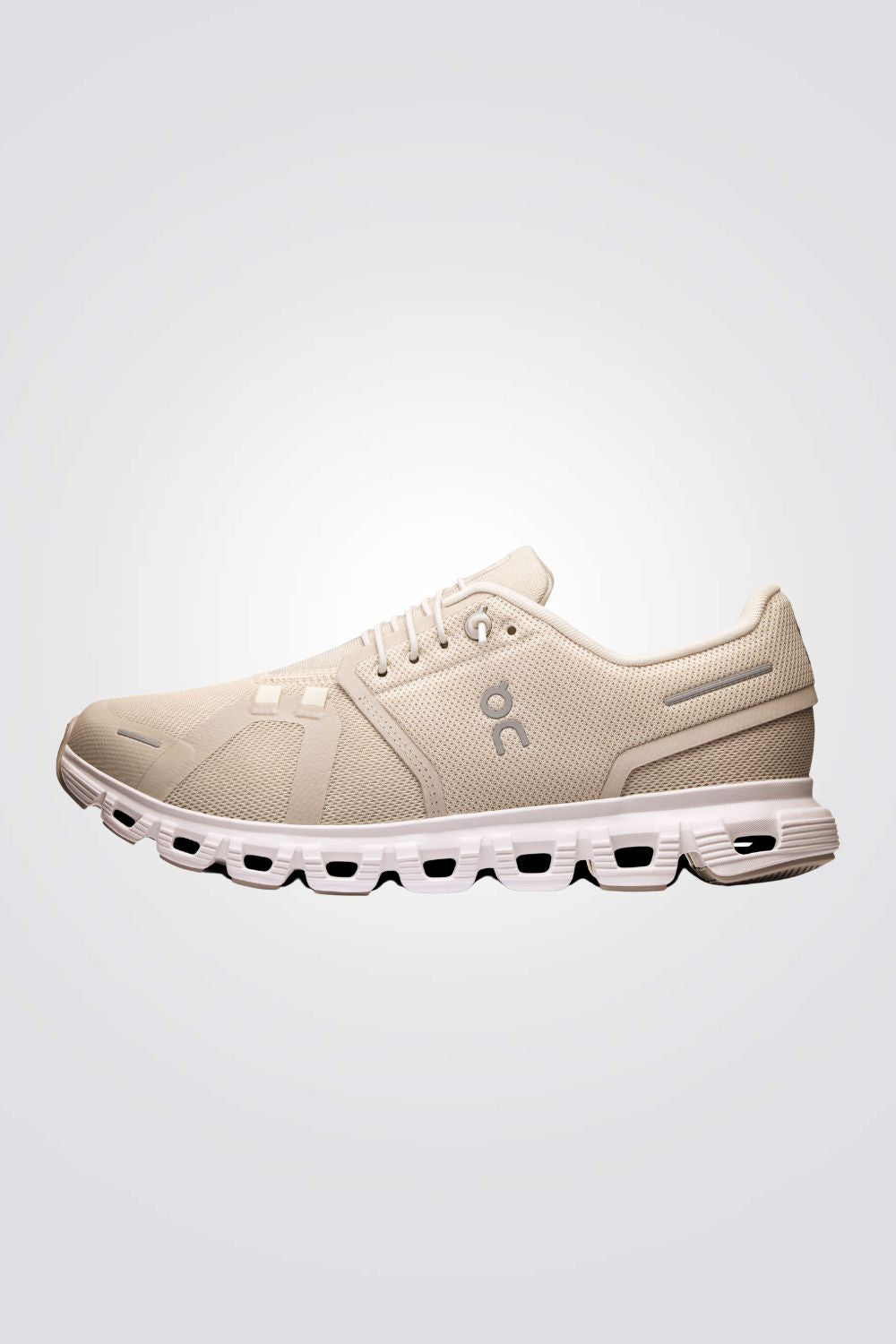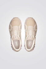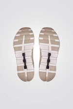 נעלי ספורט לנשים מבית המותג ON CLOUD, בצבעי בז'/לבן, עם שרוכי קשירה דקים, רפידת גרב לנעילה מהירה וקלה, סוליית גומי בטכנולוגיית Speedboard® גמישה לבלימת זעזועים ונוחות מקסימלית.