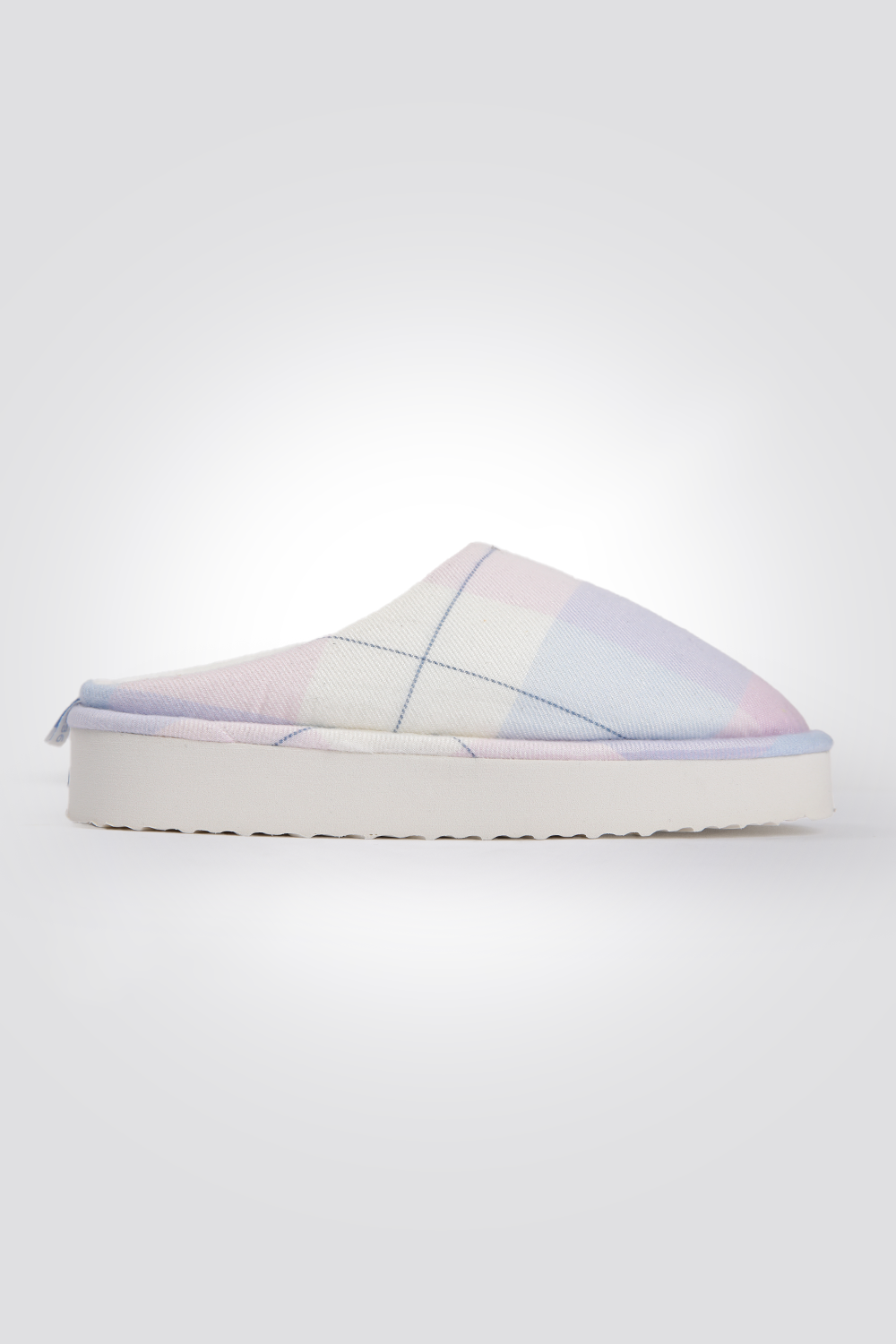 נעלי בית מפנקות מבית המותג DELTA העשויות מבד פלנל רך ומחמם בגזרת כפכף סגור, עם סוליה קשיחה ועבה במוטיב משבצות.