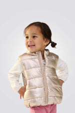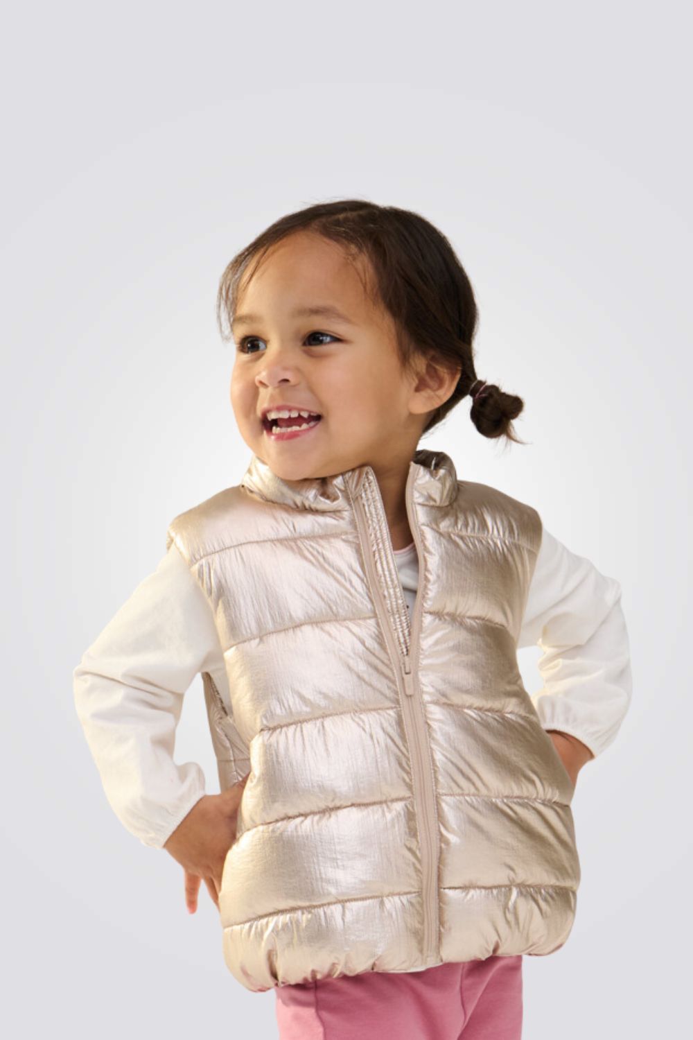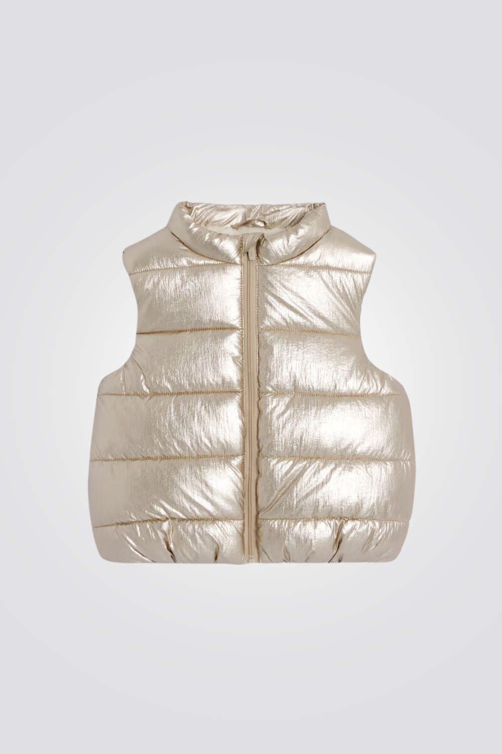 אפודת מעיל לתינוקות מבית המותג OBAIBI, בצבע זהב ,ללא שרוולים, מחממת ונוחה עם סגירת רוכסן.