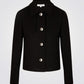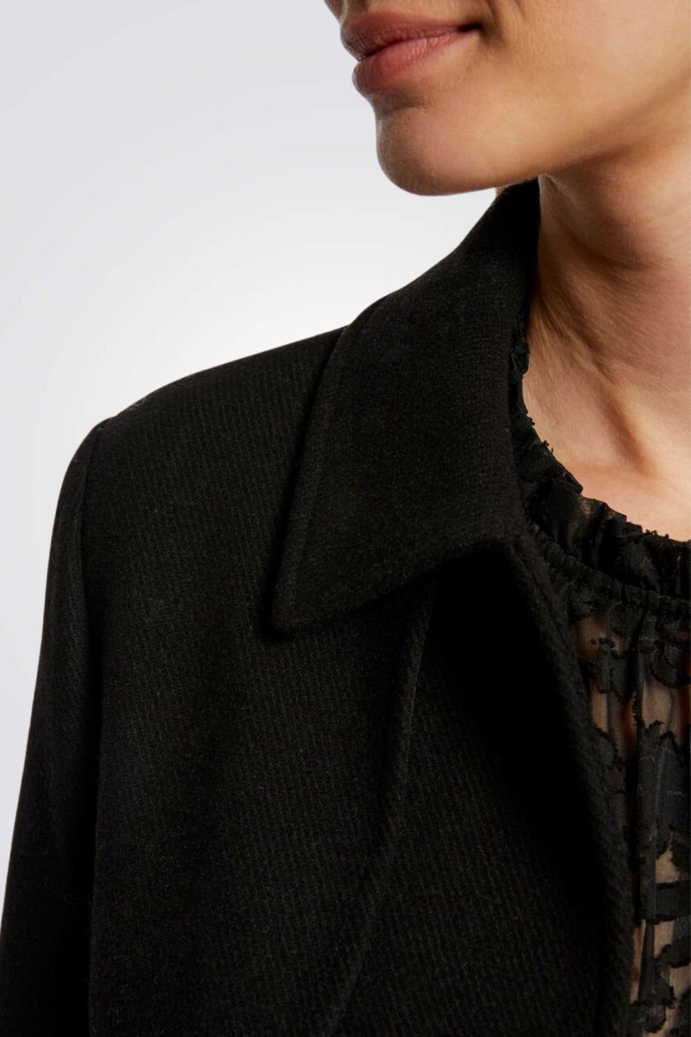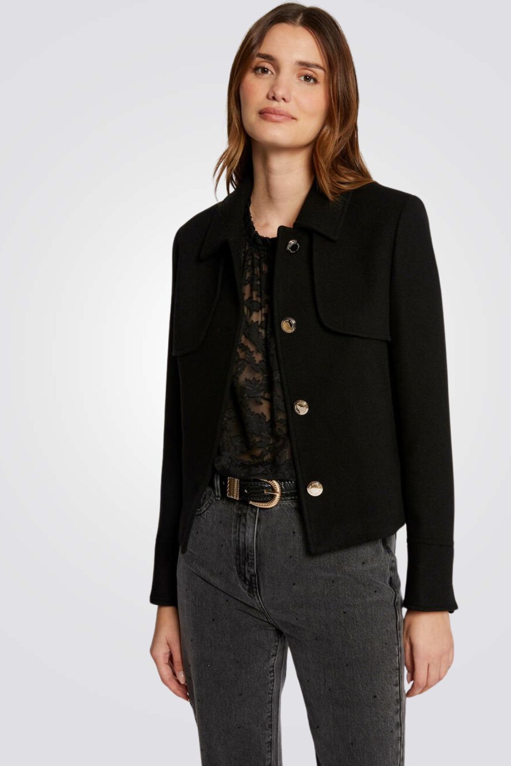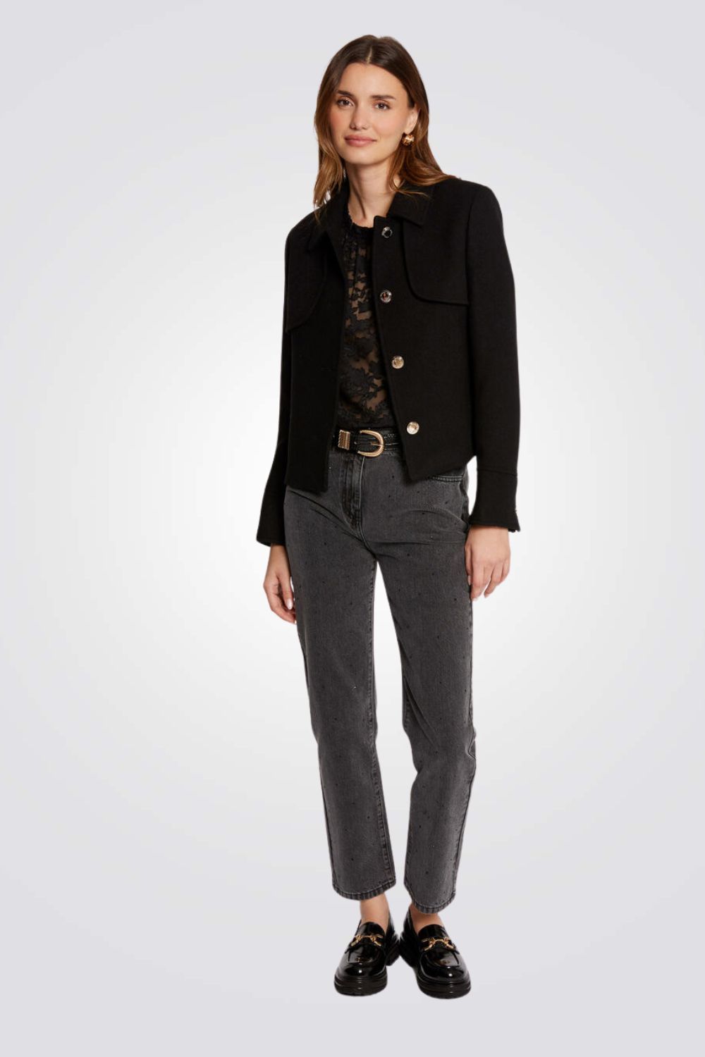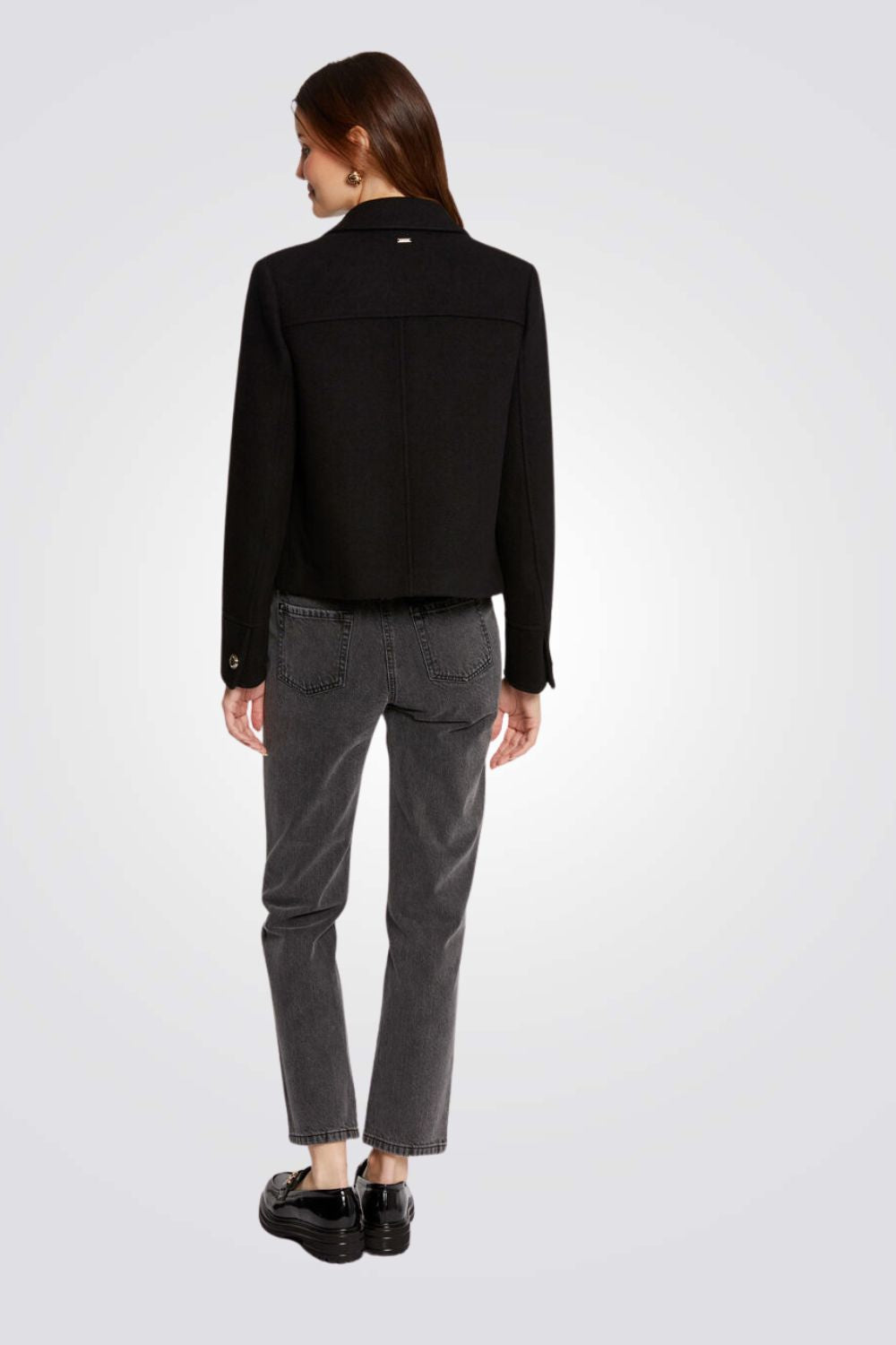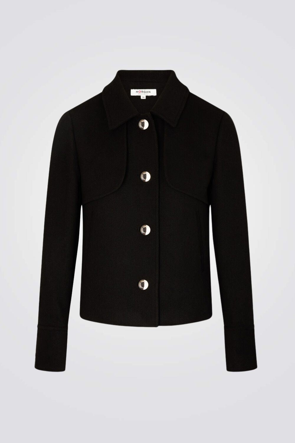 ג'קט מבית המותג MORGAN בצבע שחור בגזרה ישרה, עם שרוולים ארוכים בשילוב כתפיות מרופדות, צווארון עגול וכפתורים דקורטיביים.