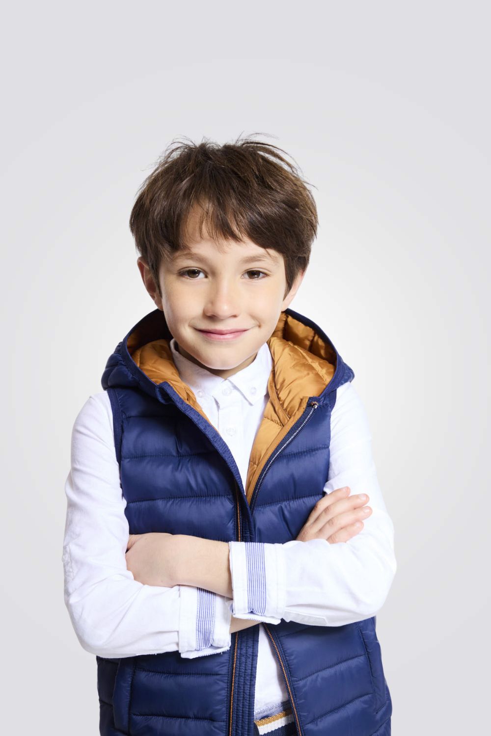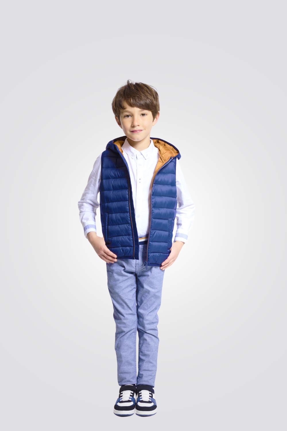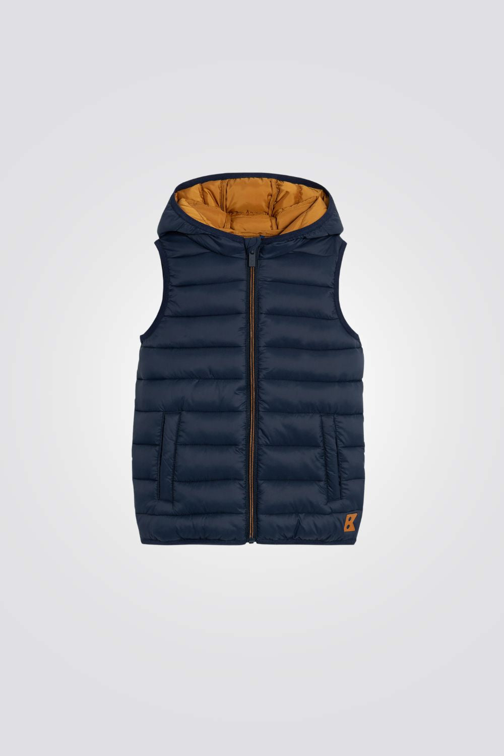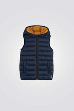 ווסט מעיל לילדים מבית המותג OKAIDI, בצבע נייבי, נעים ורך ומתאים לעונות מעבר וחורף, עם כובע, סגירת רוכסן ושני כיסים צדדיים.