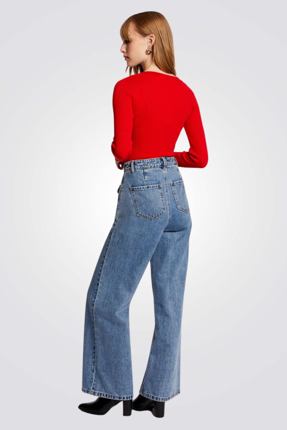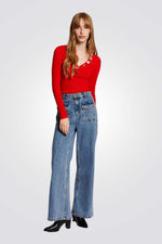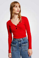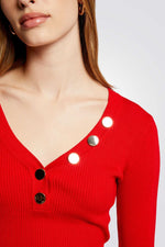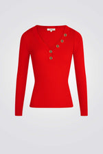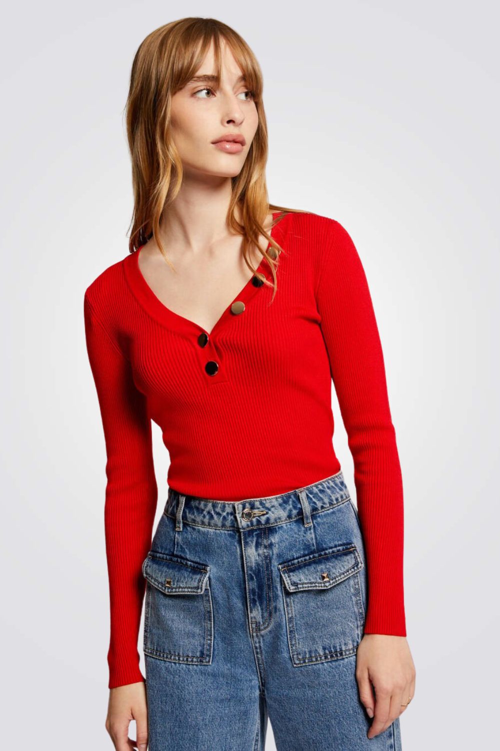 חולצת סריג מבית המותג MORGAN בצבע אדום, עם שרוולים ארוכים וצווארון וי עמוק בשילוב כפתורים דקורטיביים.