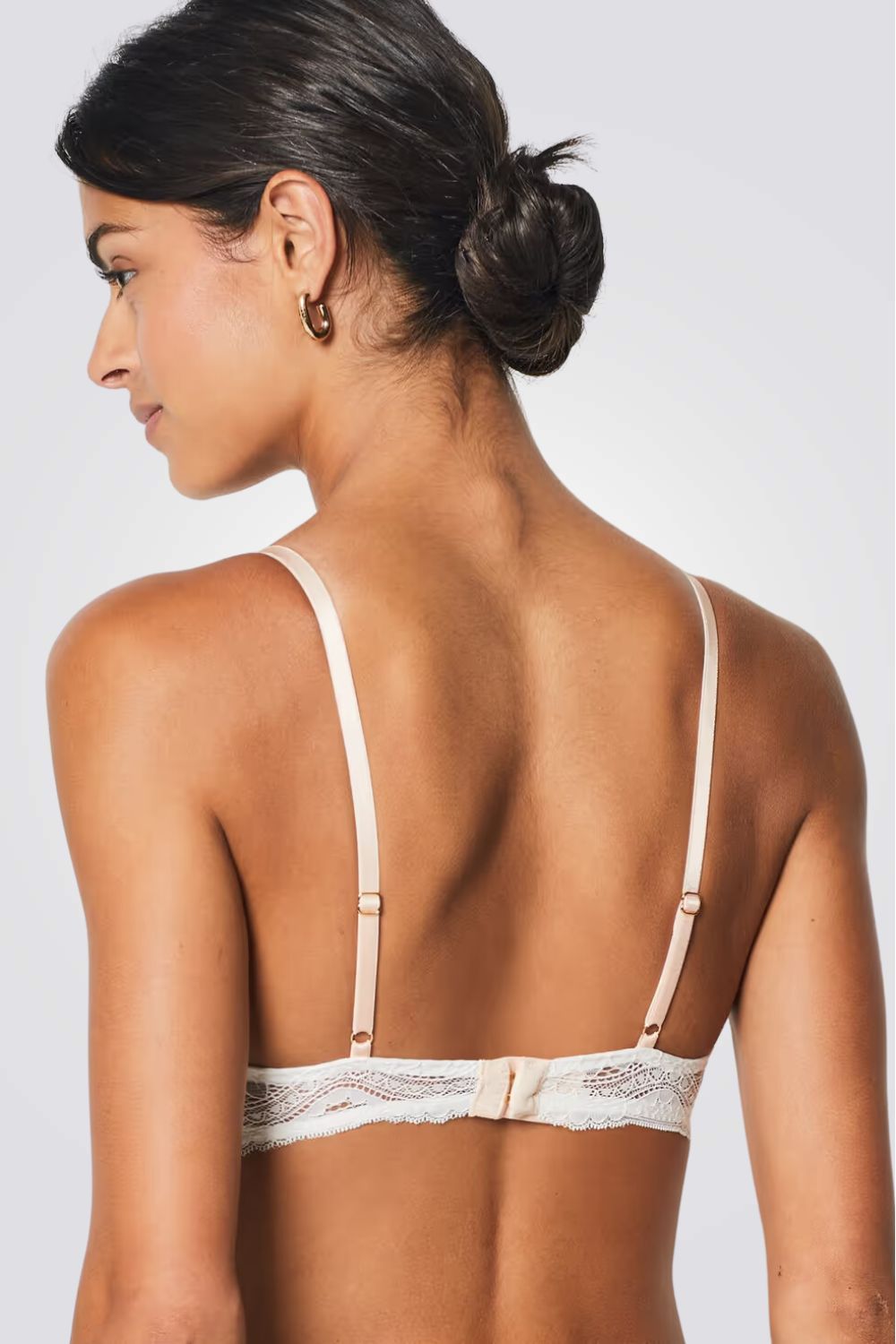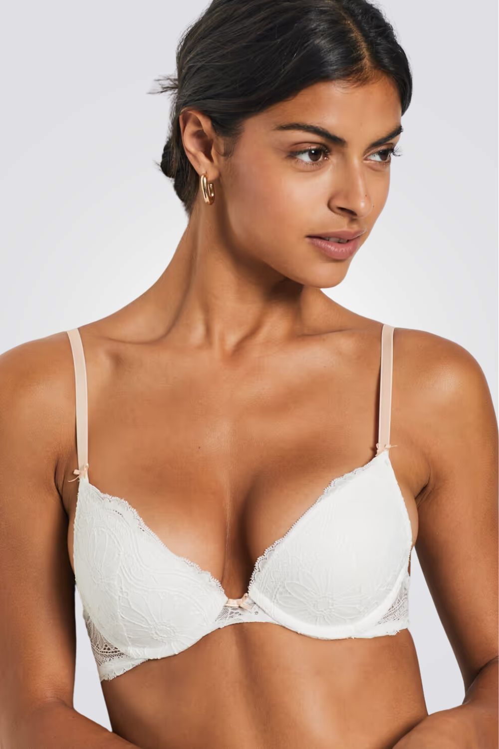 חזיית פוש אפ מבית המוותג הצרפתי ETAM בעלת כתפיות דקות ומתכווננות, עיטורי תחרה פרחוניים ועדינים המצפים את הקאפים ופפיונים קטנים במרכז החזה והכתפיות.