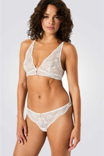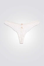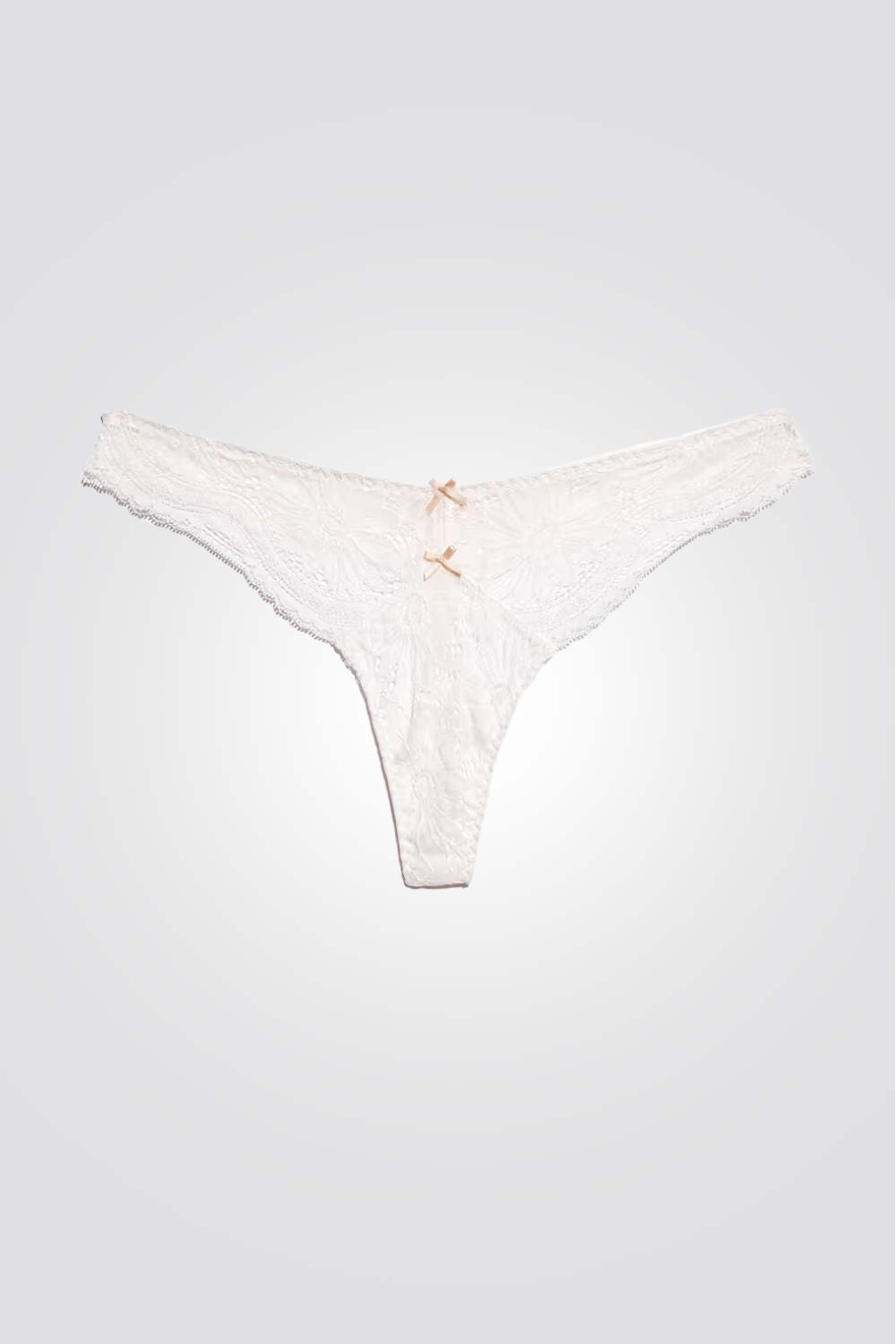 תחתוני תחרה מבית המותג ETAM בגזרת חוטיני ובצבע לבן עם גומי בקו המותניים, פפיון קטן מאחורה ושניים מקדימה.