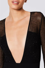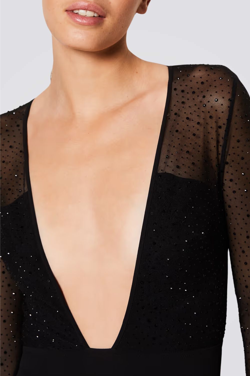 בגד גוף שקפקף מבית המותג ETAM בעל שרוולים ארוכים, מפתח צוואר וי רחב ועמוד עד קו המותניים, גב פתוח עם שרוך קשירה עדין בחלקו העליון ומעוטר כולו באבנים קטנות.