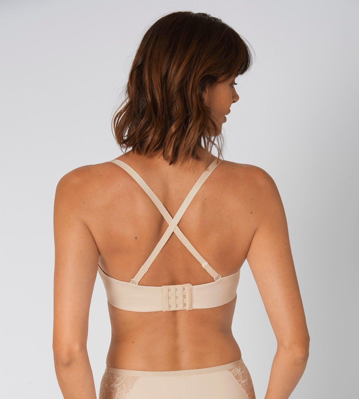 חזיית סטרפלס חדשנית מקולקציית Amourette של טריומף. חזייה ללא ריפוד, עם בטנה כפולה רכה ונעימה וקשת תומכת, מעוטרת בתחרה בדוגמת פרחים. כתפיות מתכווננות הניתנות להסרה או ללבישה במצב הצלבה בגב. רצועות צד אלסטיות ורחבות במיוחד המעניקות תמיכה מקסימלית וסגירת קרסים אחורית.