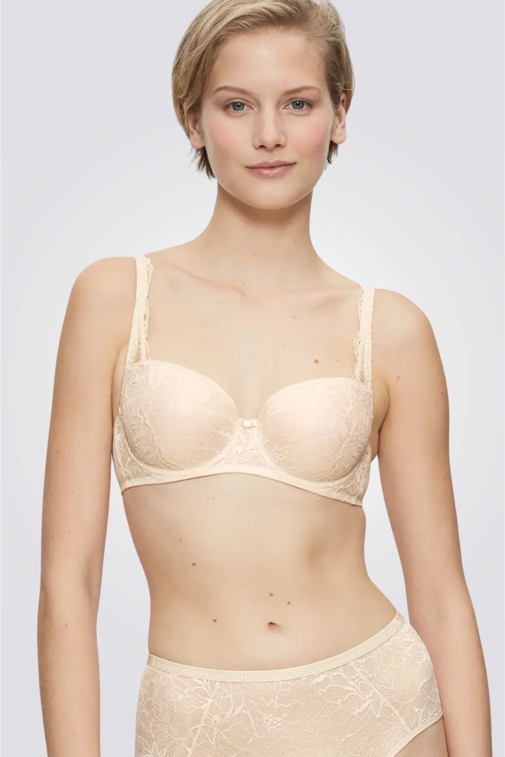 חזייה עם ריפוד קל וקשת תמיכה מעוטרת בתחרה ובפרטים עיצוביים. חזייה נוספת בהשראת החזייה הנמכרת AMOURETTE רצועות תחרה רחבות יותר מקדימה לתמיכה והתאמה מושלמת. חיתוכים חלקים המבטיחים נוחות לבישה