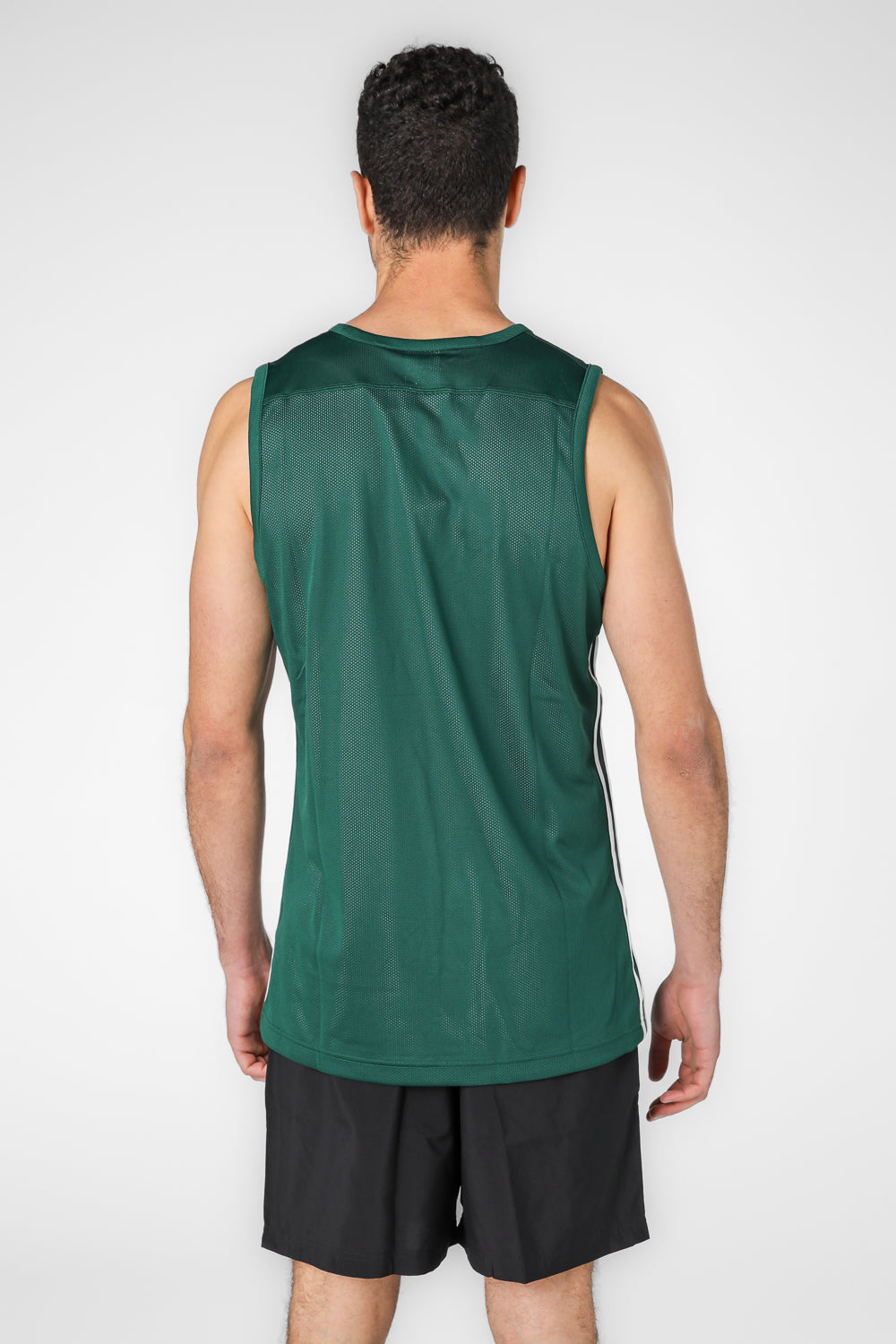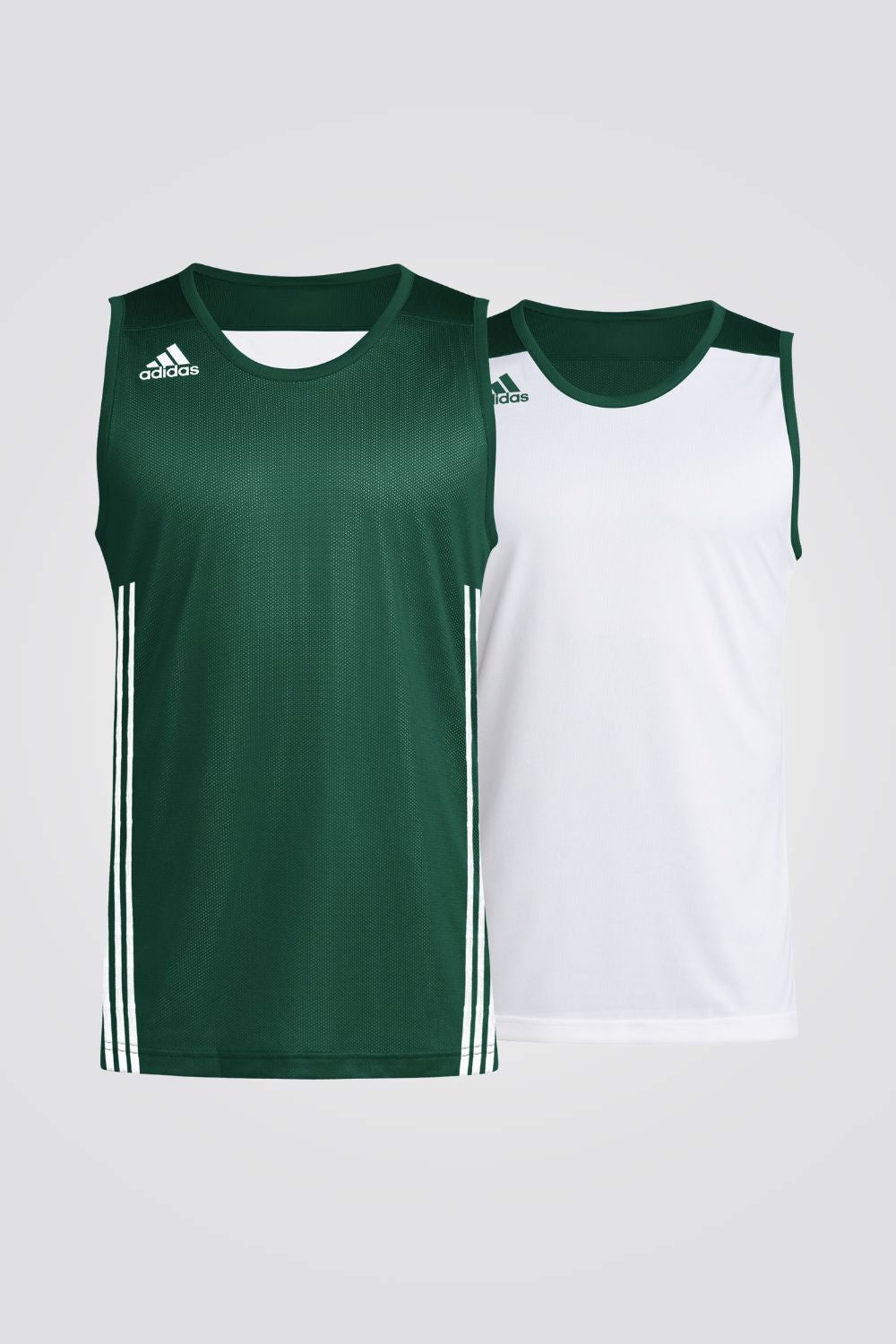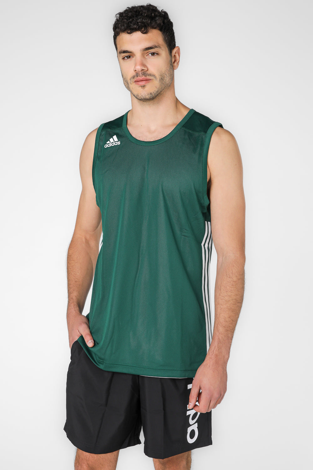 גופיית ספורט דו צדדית מבית המותג ADIDAS לגברים בצבע ירוק ולבן, בעלת אופציה לבישה משני הצדדים, עשויה בד מנדף זיעה, סמל המותג בקידמת החולצה בשני הצדדים ושלושה פסים בצידי החולצה.