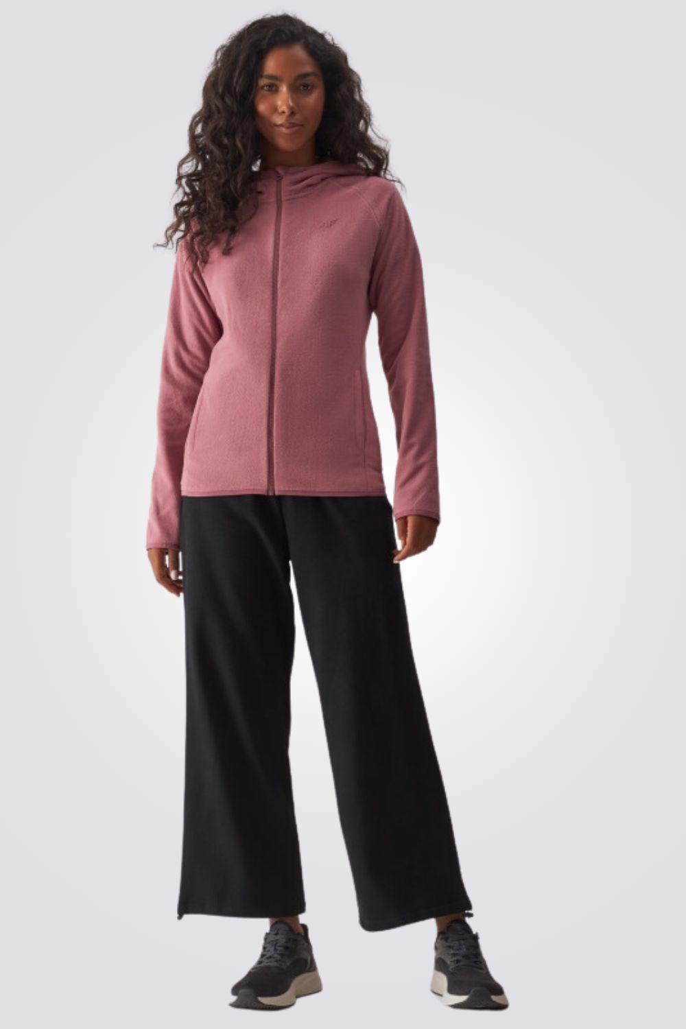 קפוצ'ון פליז לנשים מבית המותג F4,בצבע ורוד, מחמם ,נעים וקל משקל המתאים לכל פעילויות הספורט, צווארון גבוהה לשמירה על הצוואר, שני כיסים צדדיים וסגירת רוכסן.