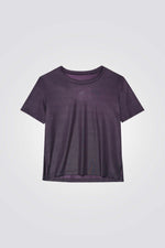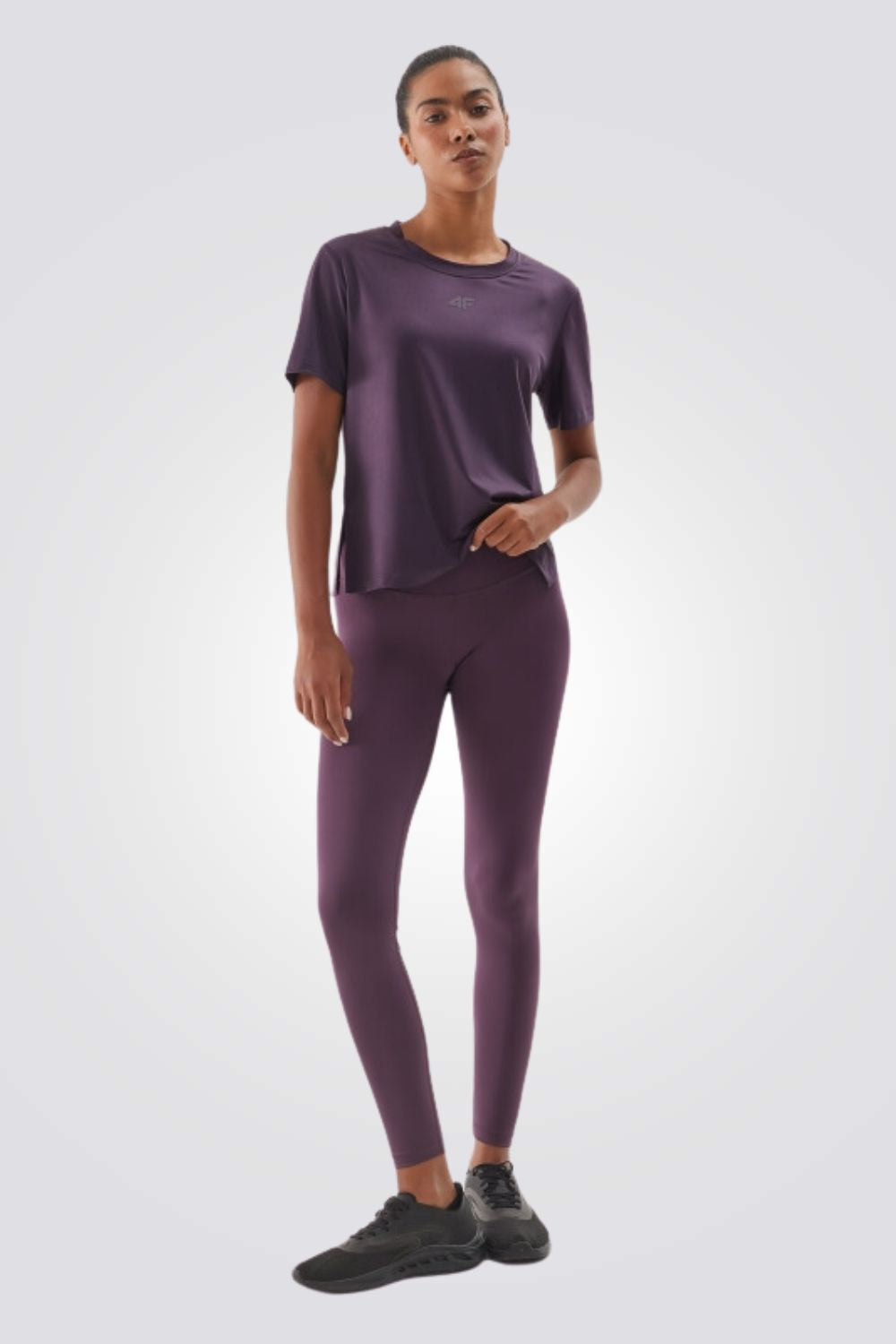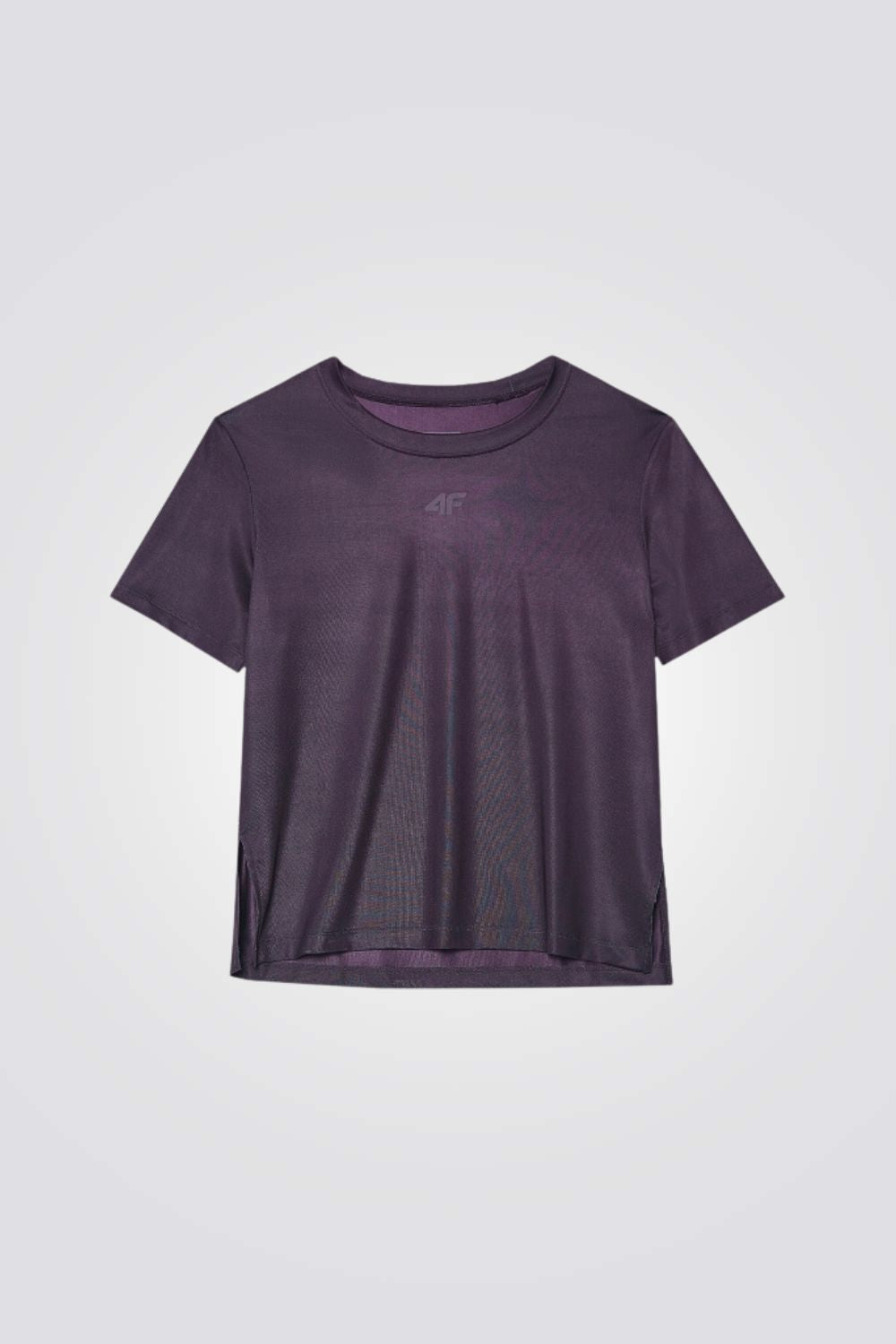 טישירט לנשים מבית המותג F4, בצבע סגול כהה עשויה מבד מנדף זיעה, קלילה ונוחה ומתאימה לאימונים.