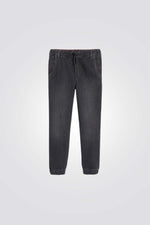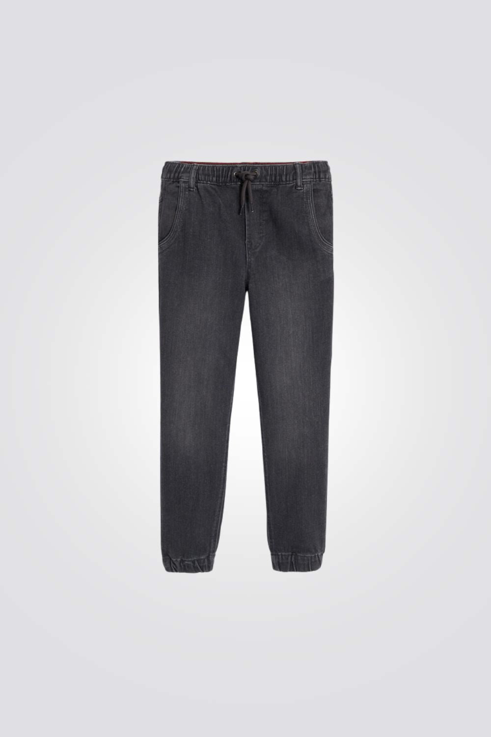 מכנסי ג'ינס לילדים מבית המותג OKAIDI, בצבע אפור כהה, קליל ונעים, עם מותן אלסטית וקשירת שרוך .