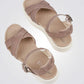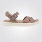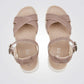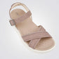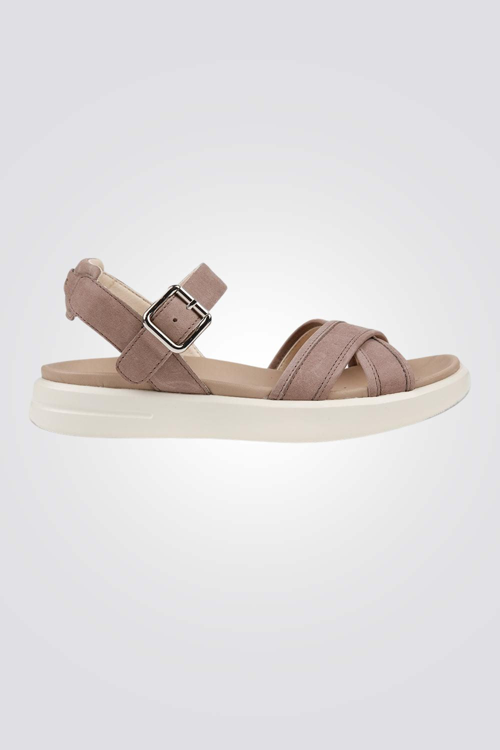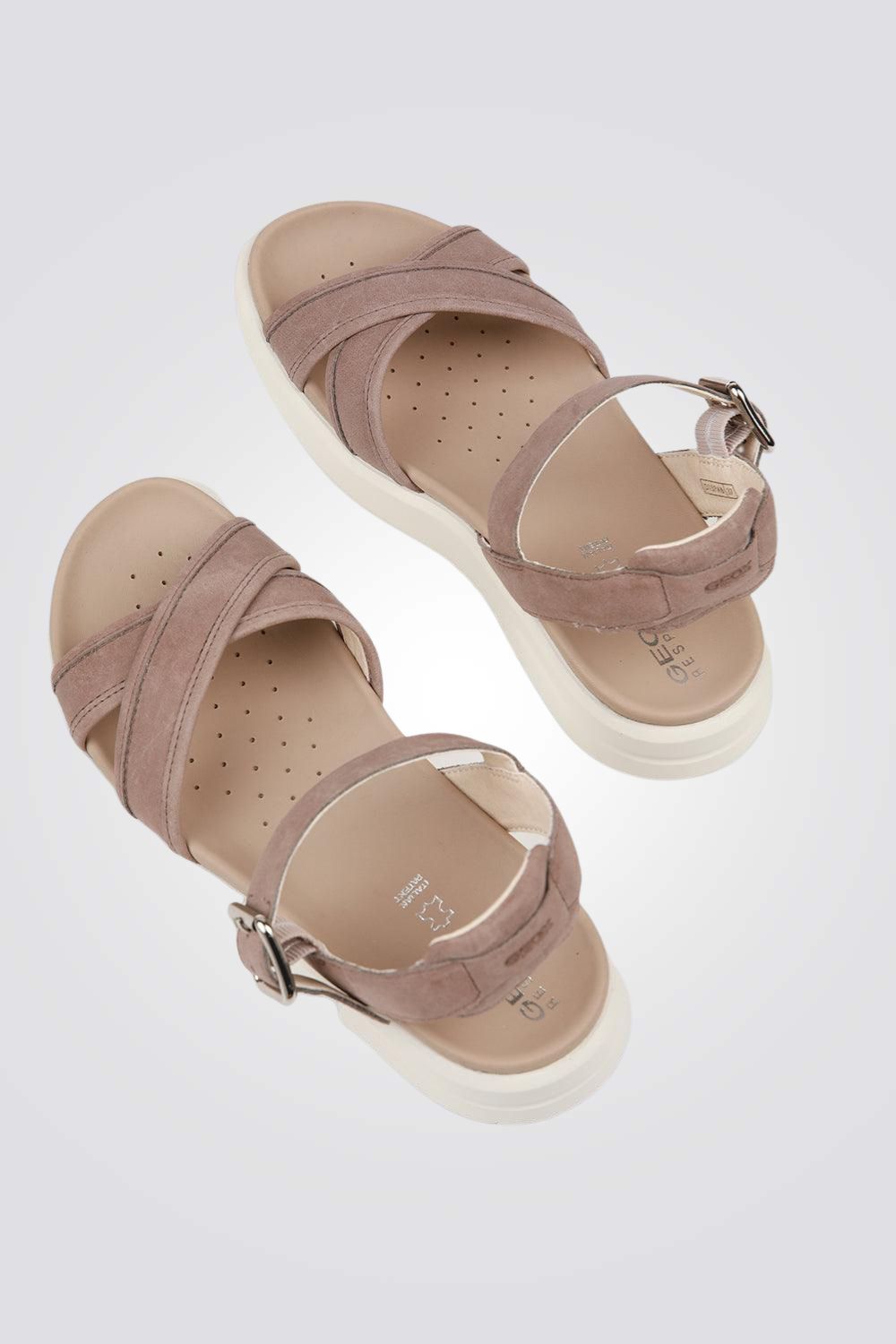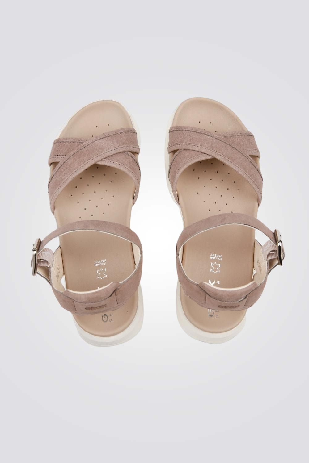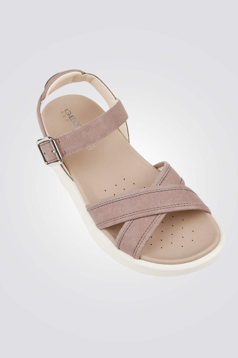 סנדלי עור מבית המותג GEOX לנשים בצבע מדברי, בעלי שתי רצועות מצטלבות בצורת X בחלק הקדמי של כף הרגל, רצועת קרסול עם אבזם מתכתי בצבע כסף וסוליה שטוחה עם טכנולוגיה נושמת המאפשרת איוורור לכף הרגל.