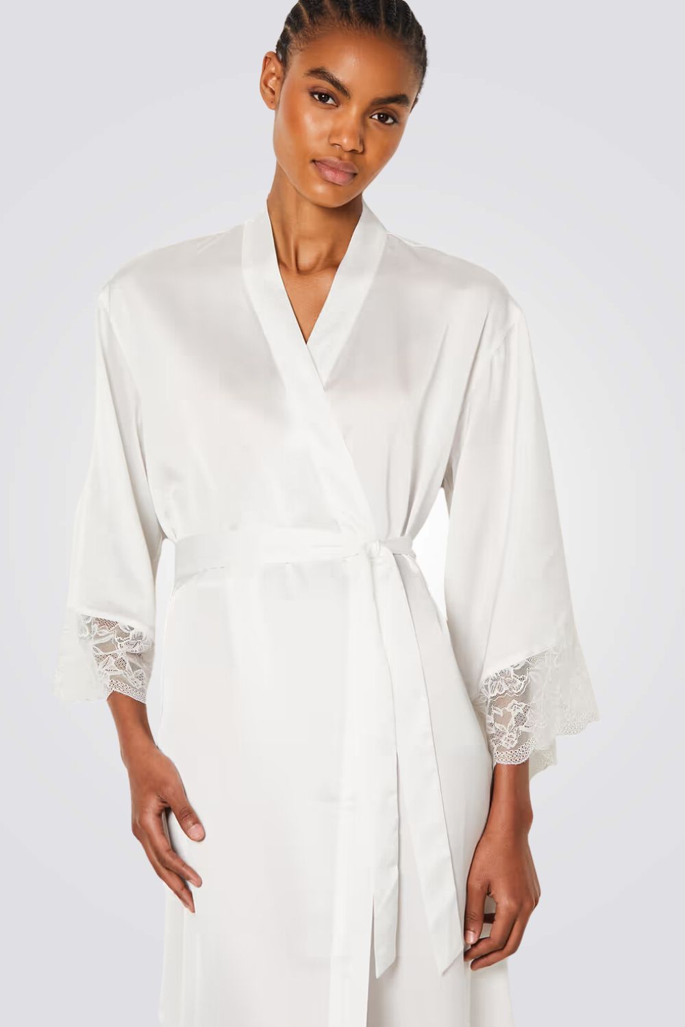 חלוק סאטן לבן מבית המותג ETAM העשוי מבד סאטן מבריק ונעים בגזרה ארוכה, בעל שרוולים ארוכים, שרוך קשירה וסיומות תחרה פרחונית עדינה.