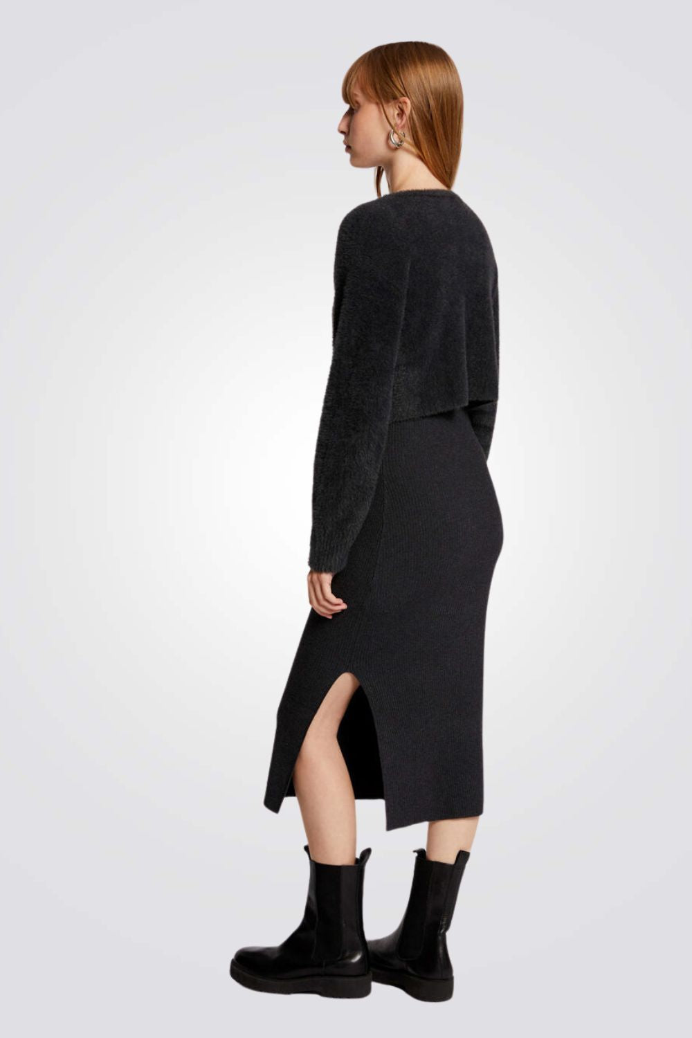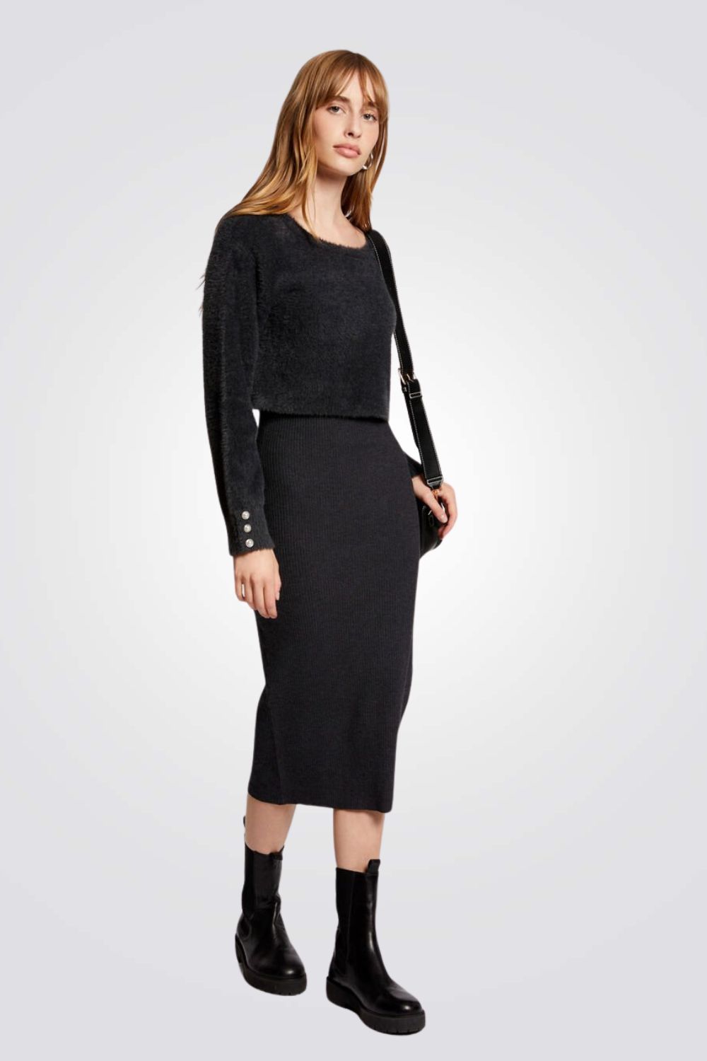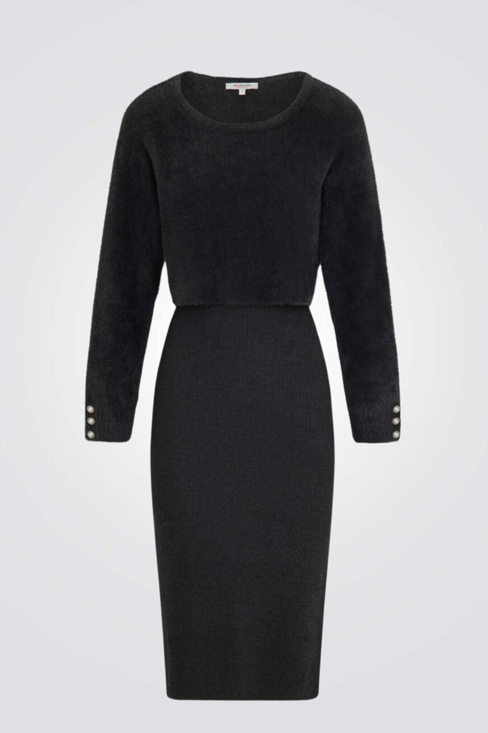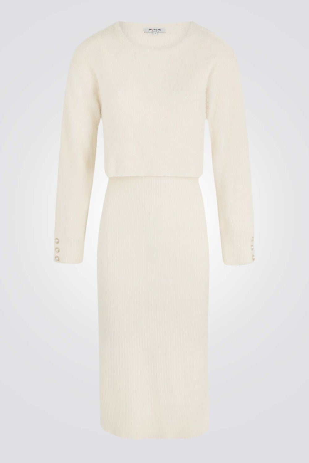 שמלת סריג מבית המותג MORGAN באורך מידי בעל אפקט של חולצה וחצאית עם שרוולים ארוכים בשילוב כפתורים דקורטיביים, צווארון עגול וחריצים צדדיים בחלק התחתון של השמלה