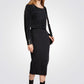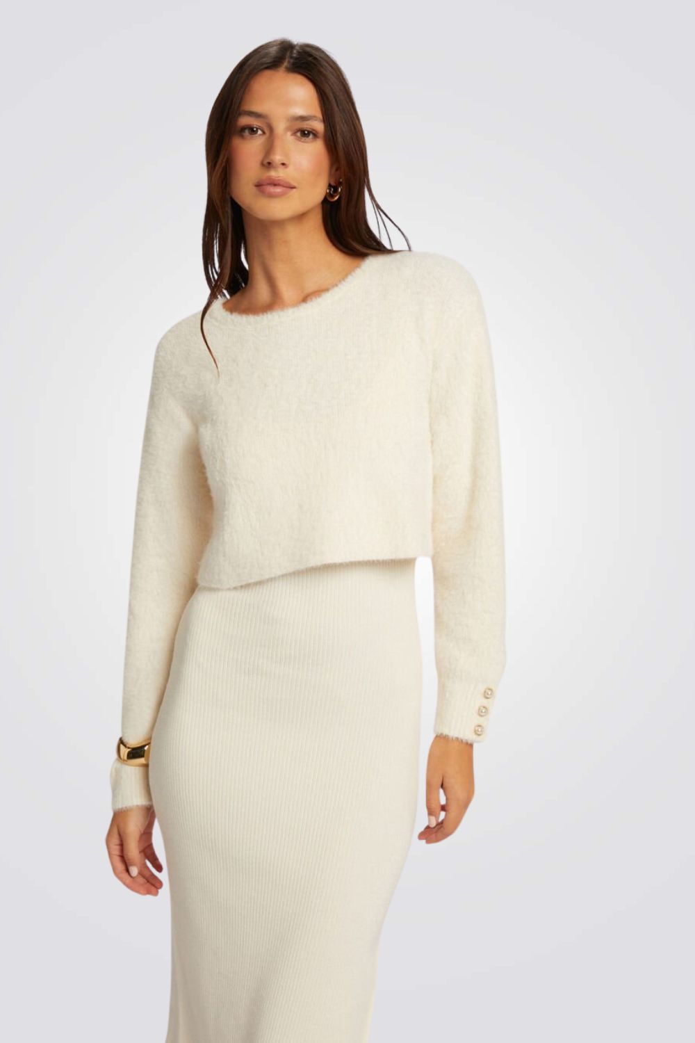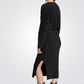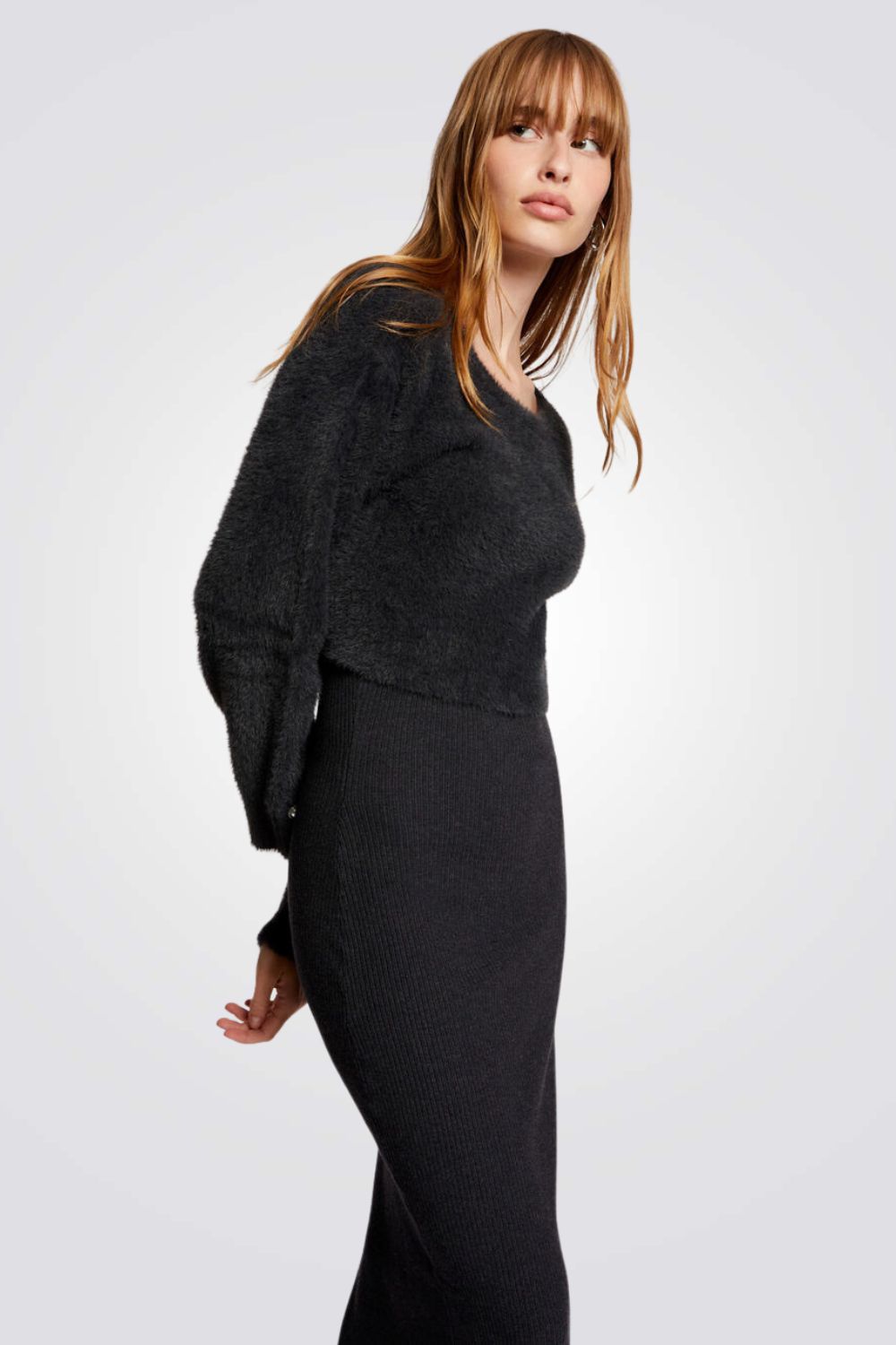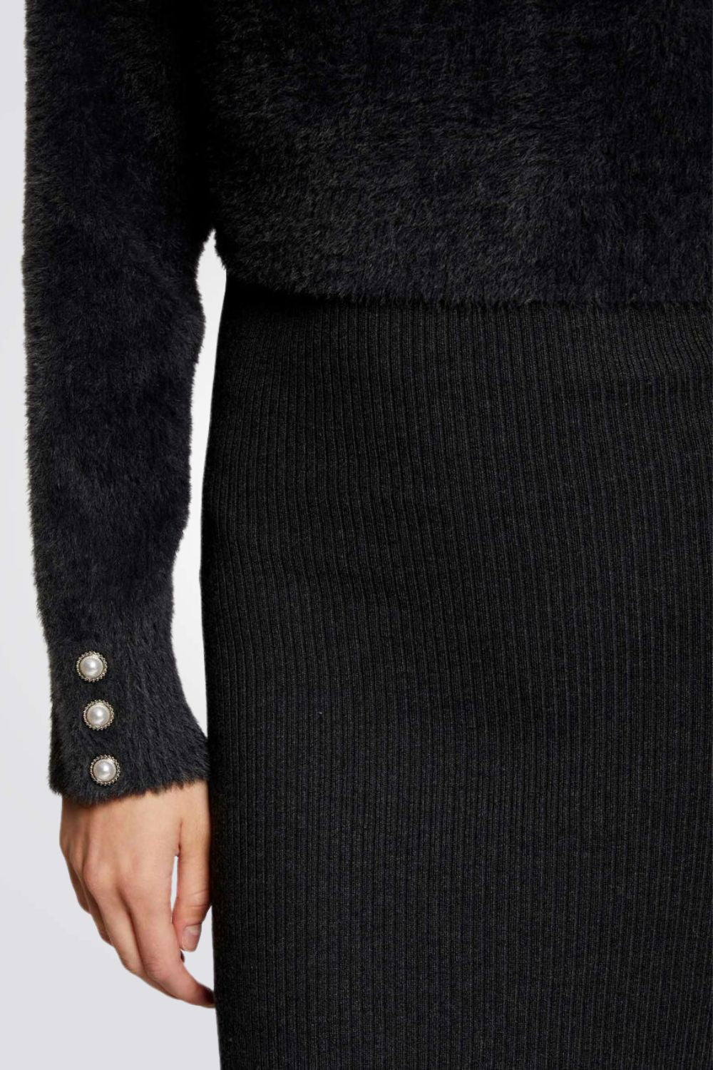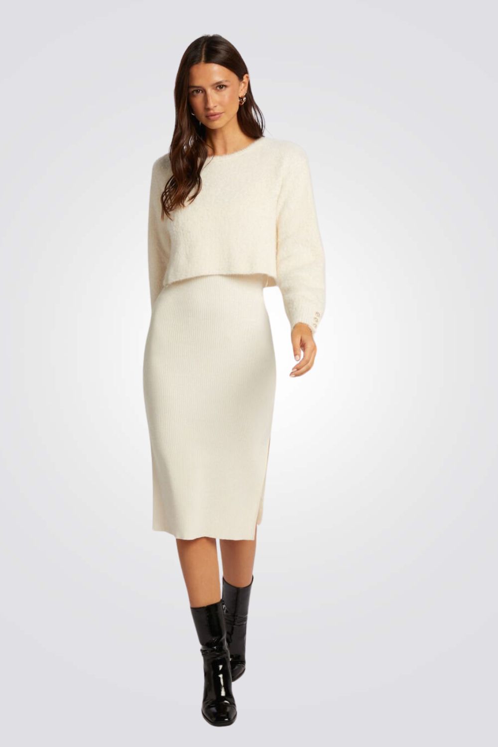 שמלת סריג מבית המותג MORGAN באורך מידי בעל אפקט של חולצה וחצאית עם שרוולים ארוכים בשילוב כפתורים דקורטיביים, צווארון עגול וחריצים צדדיים בחלק התחתון של השמלה