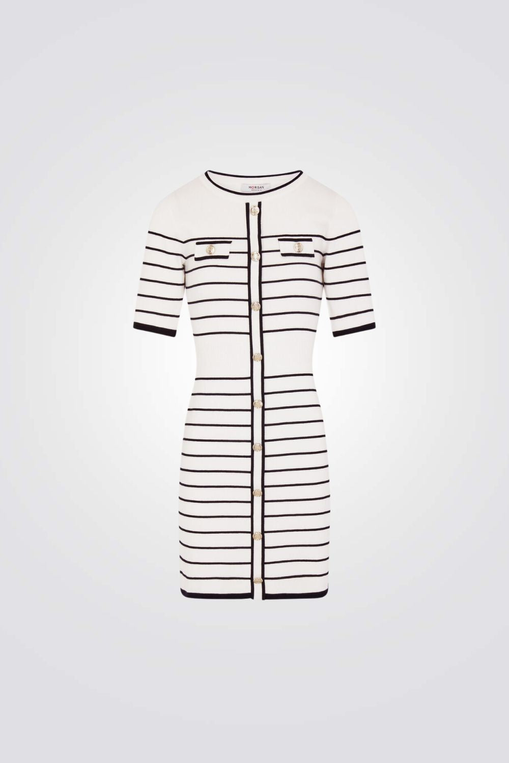 שמלת סריג קצרה מבית המותג MORGAN, עם הדפס פסים, שרוולים קצרים, צווארון עגול וכפתורים דקורטיביים בחזית.