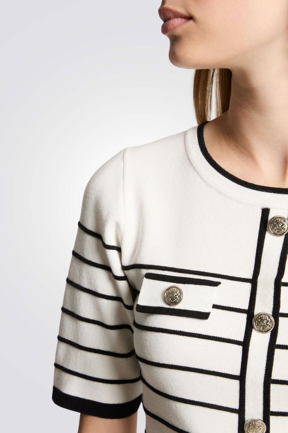 שמלת סריג קצרה מבית המותג MORGAN, עם הדפס פסים, שרוולים קצרים, צווארון עגול וכפתורים דקורטיביים בחזית.