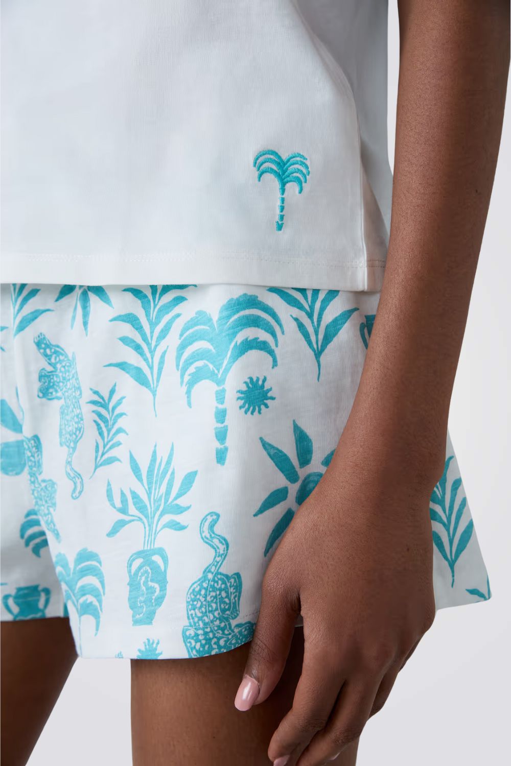 חולצת פיג'מה מבית המותג ETAM עשויה בד כותנה מלא בעלת שרוולים קצרים, צווארון עגול, הדפס גדול קייצי ל הגב ורכמה קטנה של דקל בשולי החולצה.