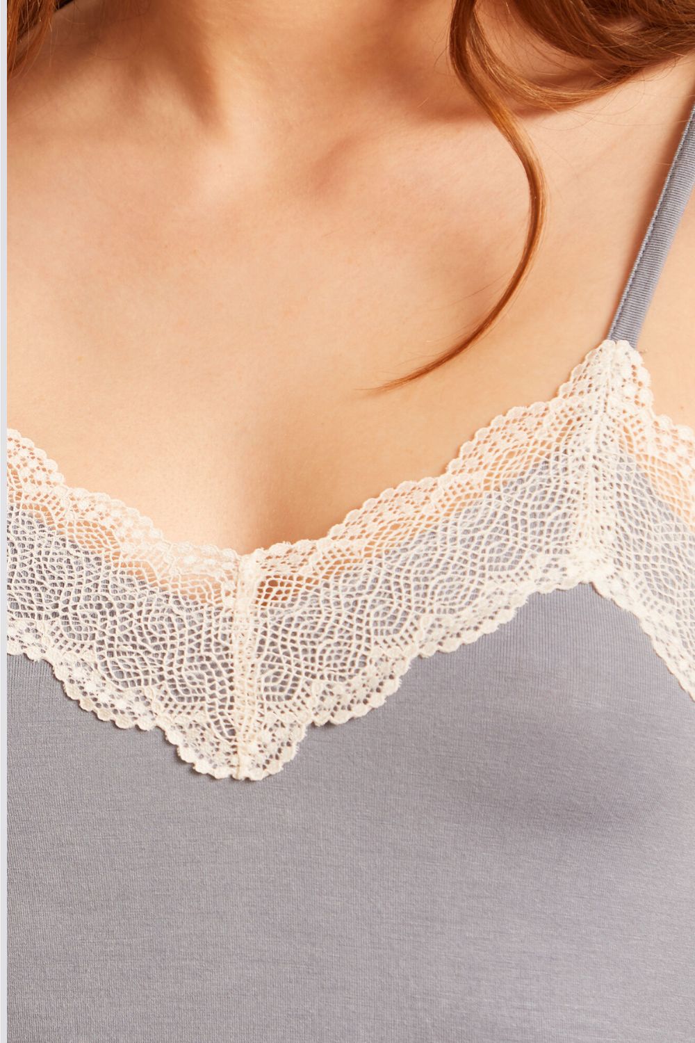 כותונת של המותג ETAM בגוון ירקרק בהיר, עשויה בד דק ונעים. מחשוף וי בגימור תחרה עדינה וכתפיות דקיקות הניתנות לכיוונון. .