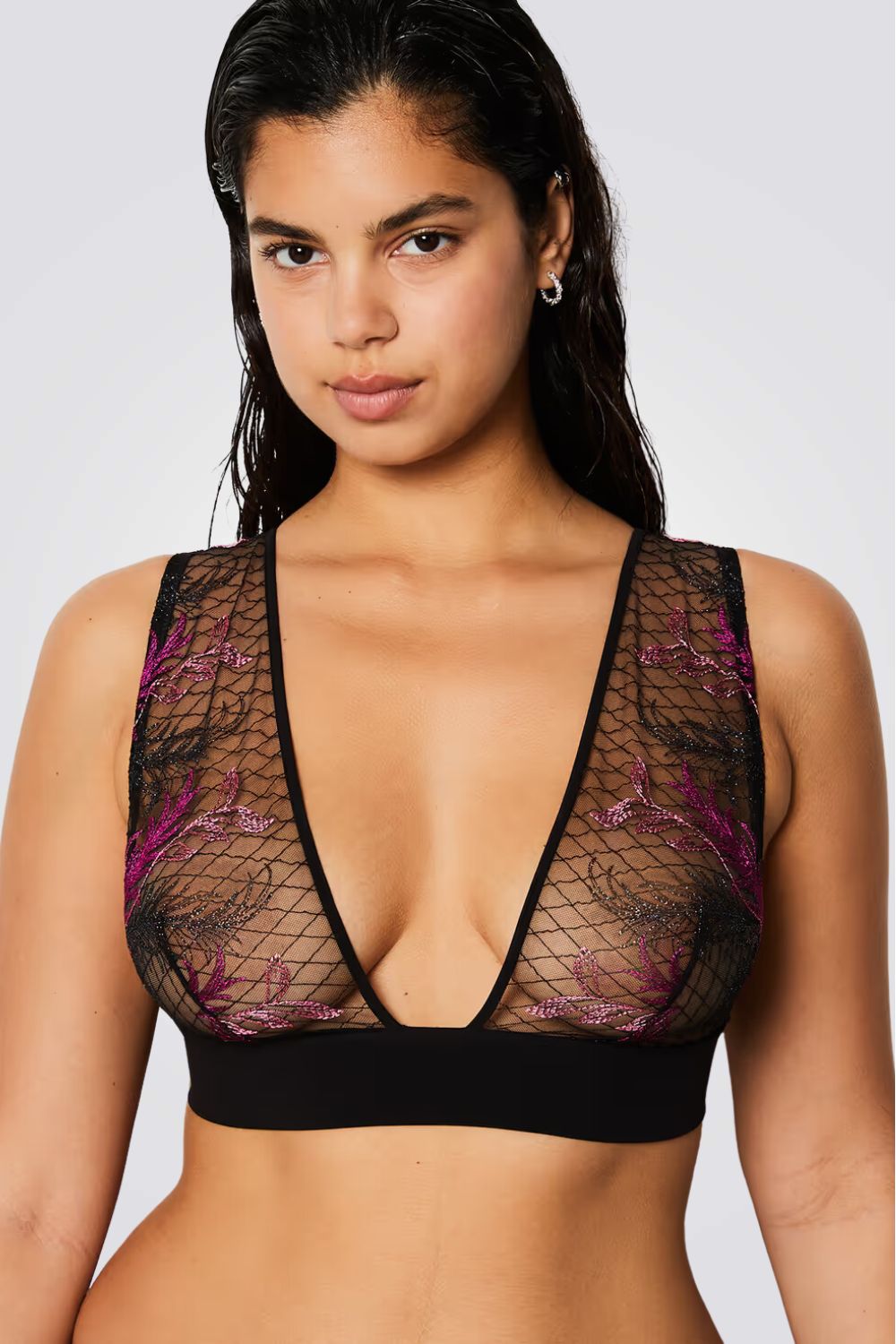 חזיית משולשים מבית המותג הצרפתי ETAM בעלת רצועת גומי עבה בקו המותניים ועשוייה מבד עדין שקוף עם רקמה פרחונית וסגירת קרסים להתאמה אישית.
