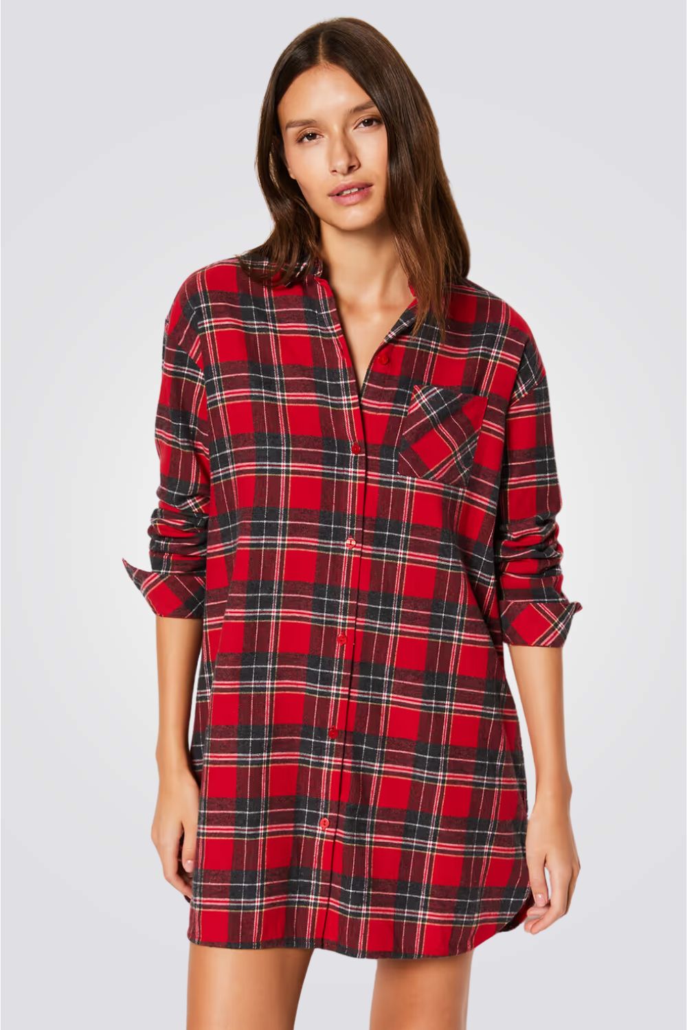 כותונת לילה מבית המותג הצרפתי ETAM, עשויה מכותנה רכה ונעימה, בהדפס משובץ עם סגירת כפתורים ושרוולים ארוכים.