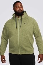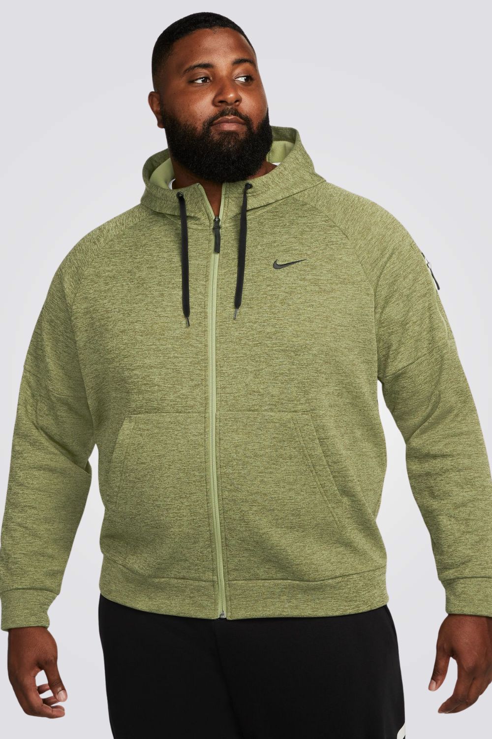 סווטשירט לגברים מבית המותג NIKE, בצבע ירוק, עשוי מבד תרמי השומר על חום בזמן האימון, עם קפוצ'ון, סגירת רוכסן ושני כיסים צדדיים.