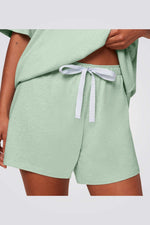סט מורכב מחולצה ומכנסיים קצרים, הפיג'מה עשוי משילוב של בד כותנה וסיבי טנסל.