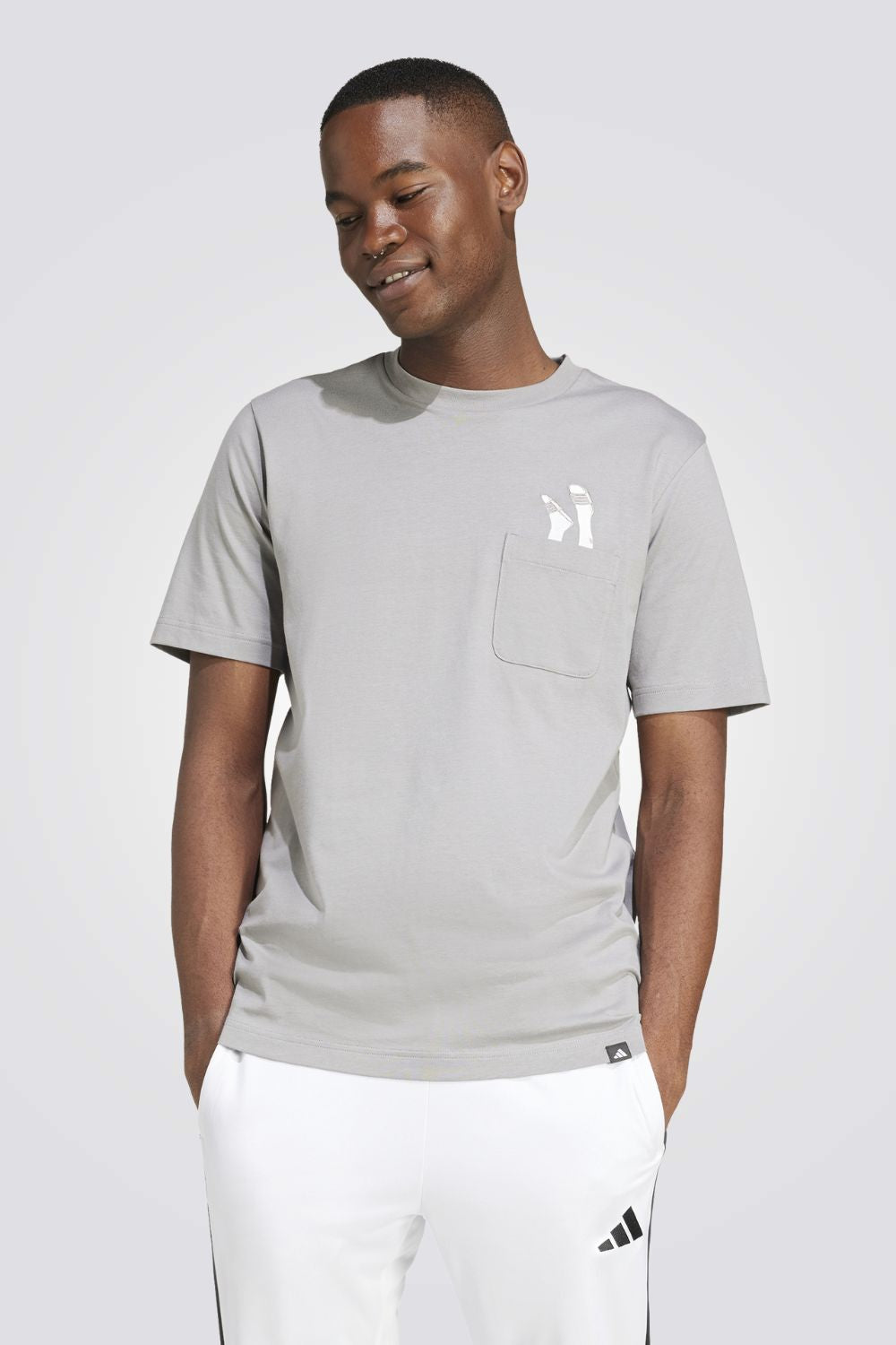 טי שרט מבית המותג ADIDAS לגברים בצבע אפור, מבד קליל ונוח, שרוולים קצרים, צווארון עגול וכיס בקידמת החולצה באפור.