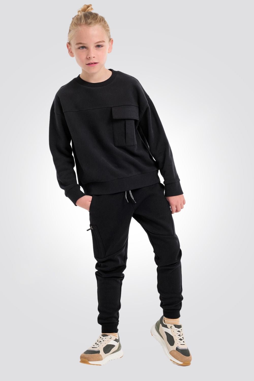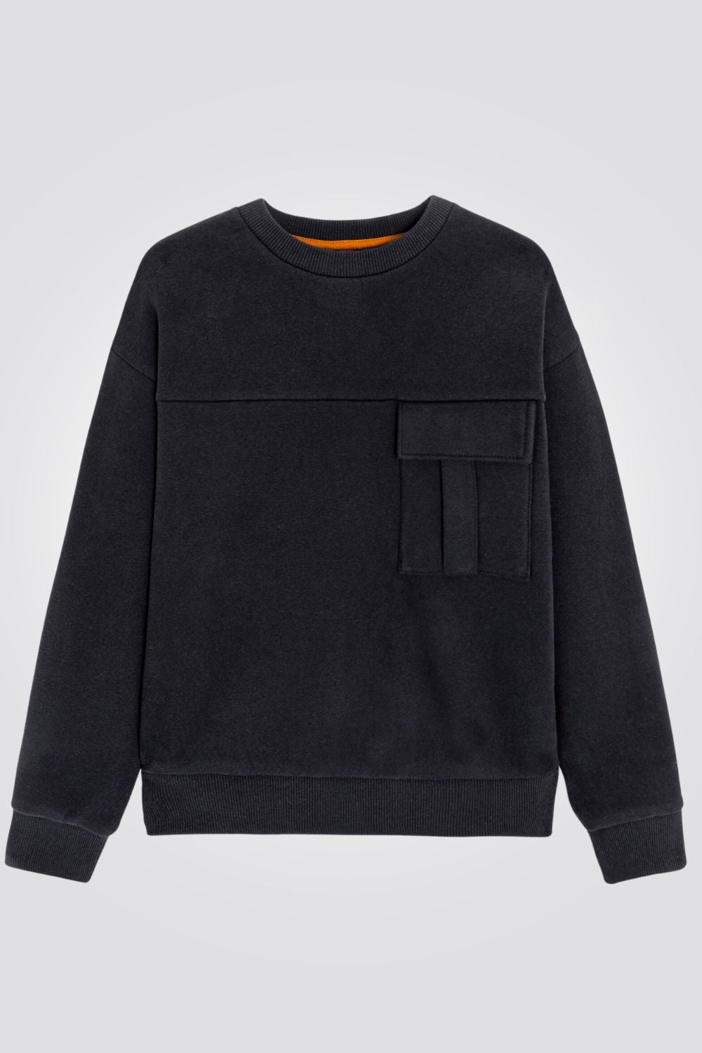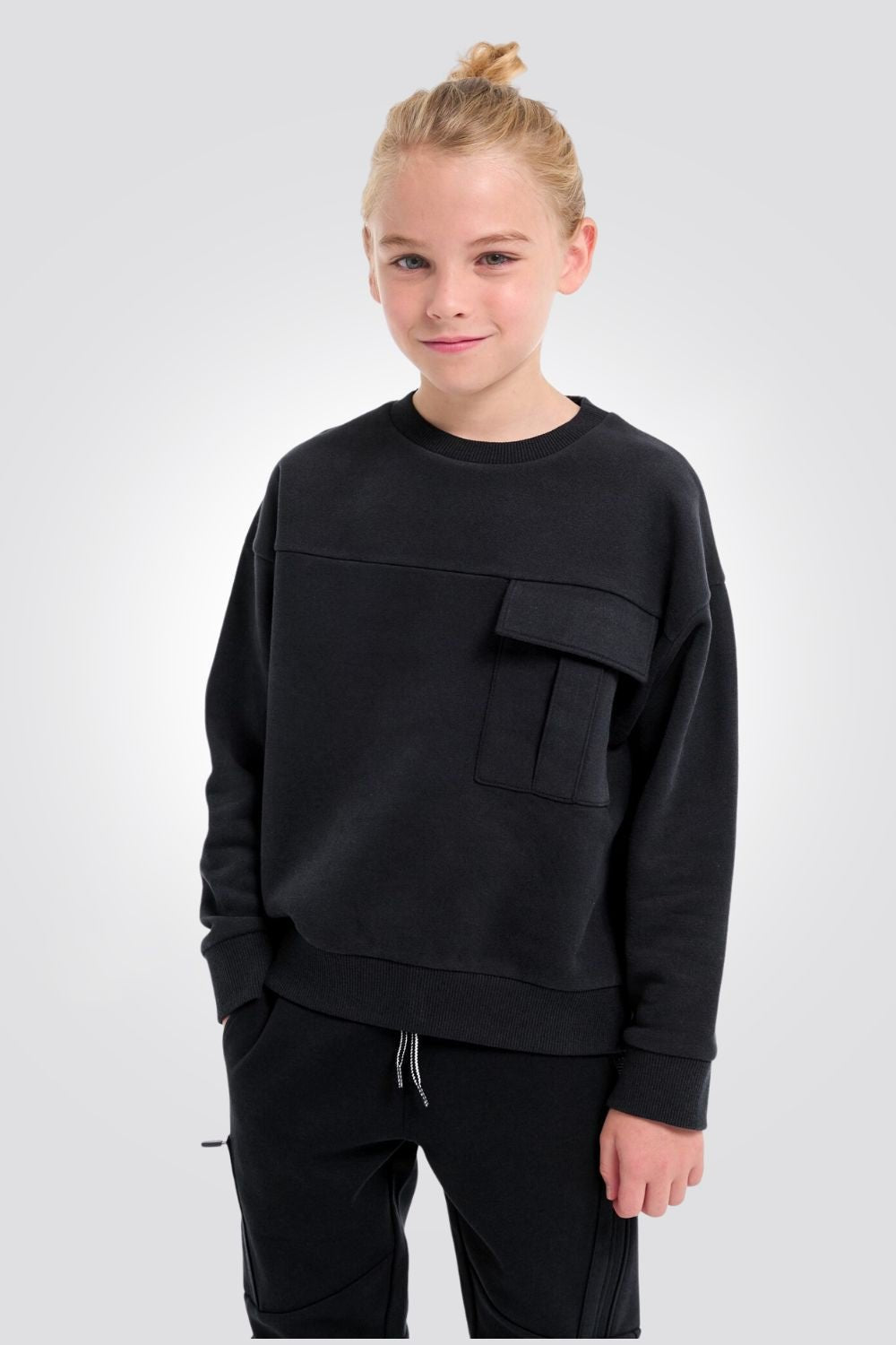 סוויטשירט ילדים באפור מלאנג' כהה עם כיס דגמח בחזית