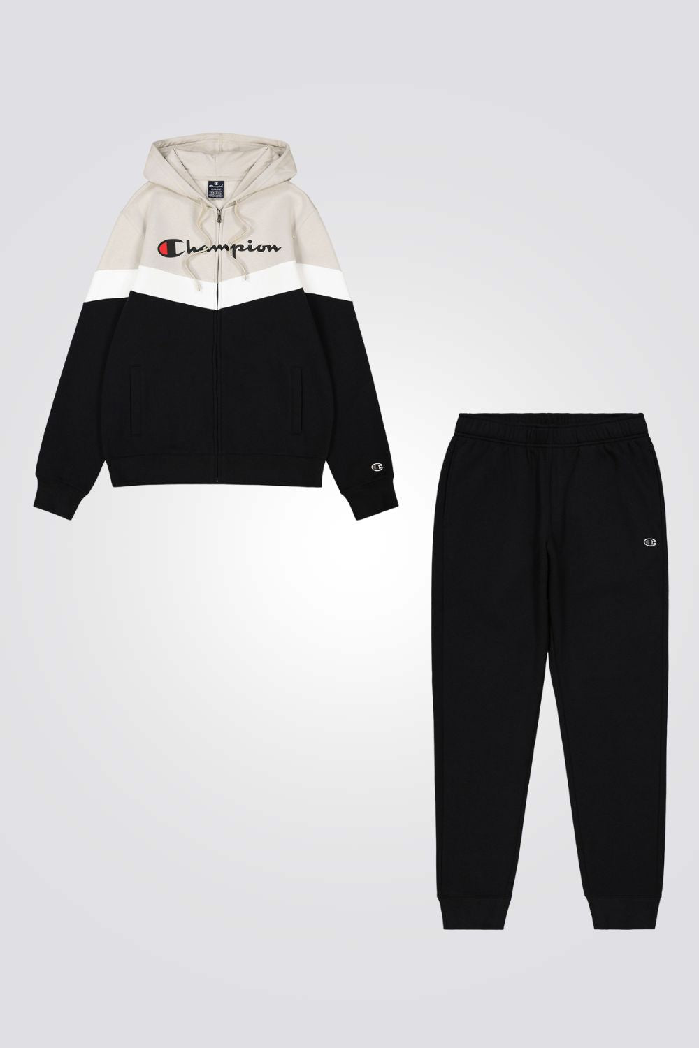 חליפה לגבר מבית המותג CHAMPION, סווטשירט עם קפוצ'ון ורוכסן בצבע שחור ובז' עם לוגו המותג ושני כיסים צדדיים, ומכנס פוטר בצבע שחור ושני כיסים צדדיים, סיומת גומי.