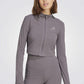 ג'קט אימונים דק מבית המותג ADIDAS לנשים בצבע אפור, בעל שרוולים ארוכים דקים, ריצרץ לסגירה, עשוי מבד רך ונמתח וסמל המותג באפור רקום בקידמת הג'קט.