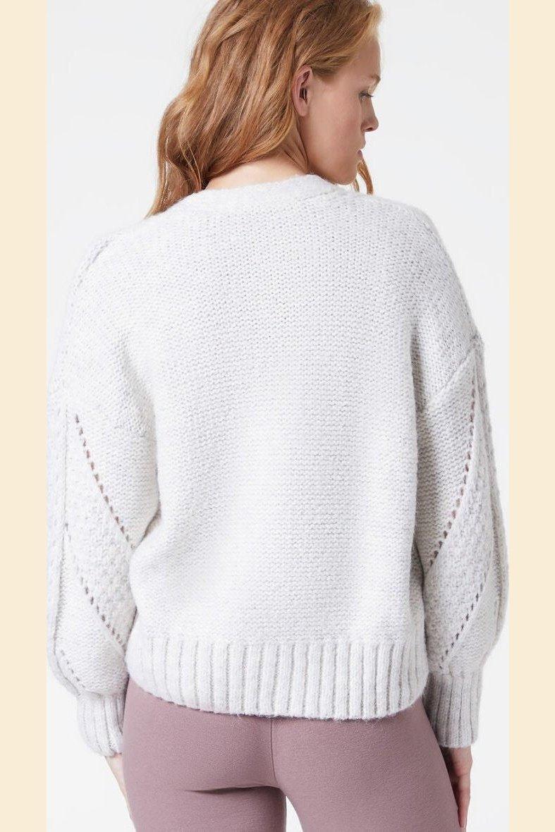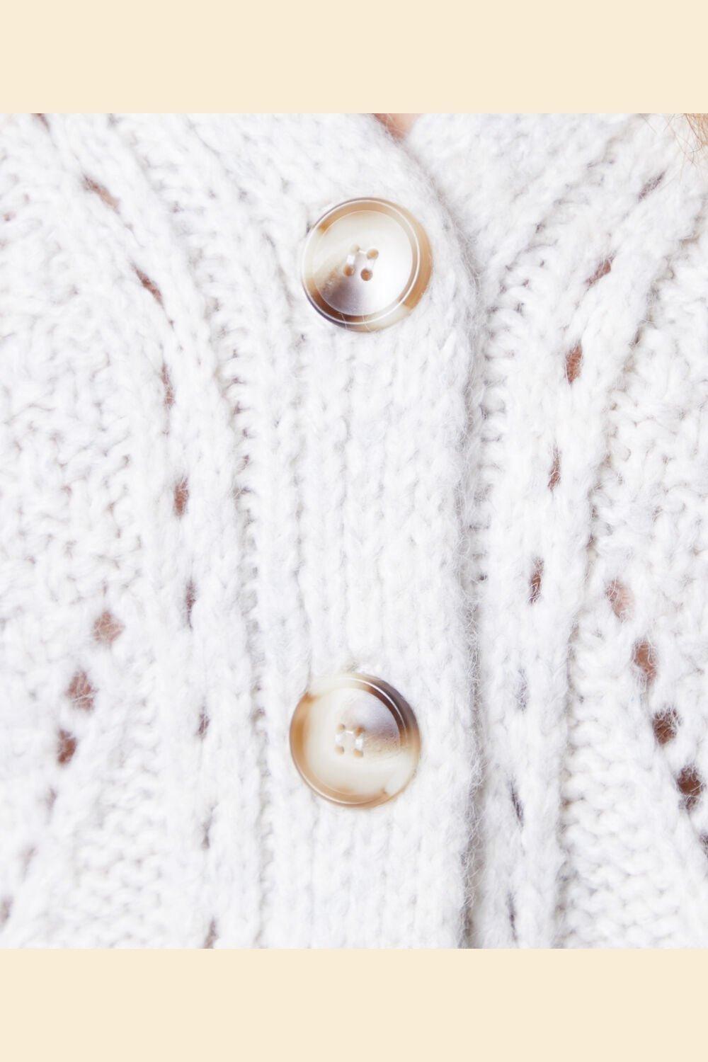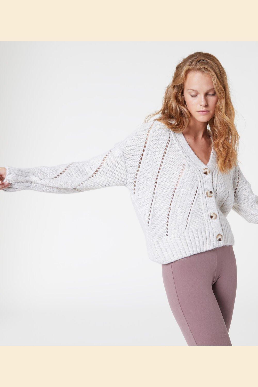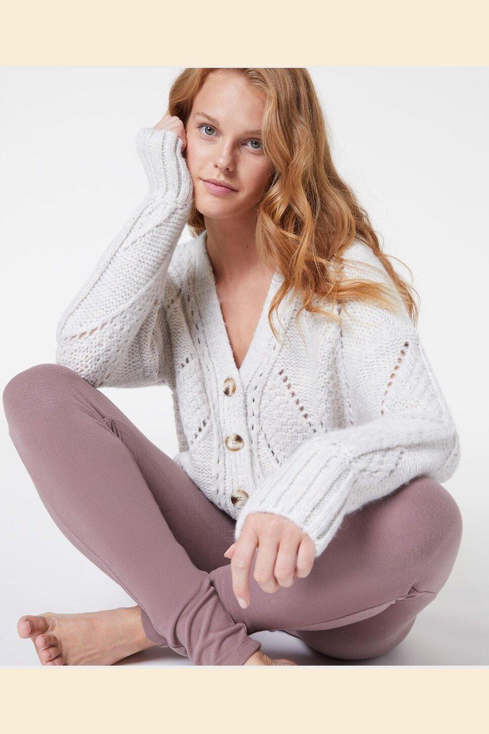 סריג קרדיגן רך וחמים מבית המותג הצרפתי ETAM בגזרה קצרה עם מפתח צוואר וי, סיומת מנג'ט בשרוולים ובתחתית וסגירת כפתורים קדמית.