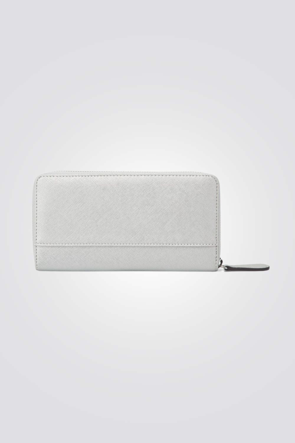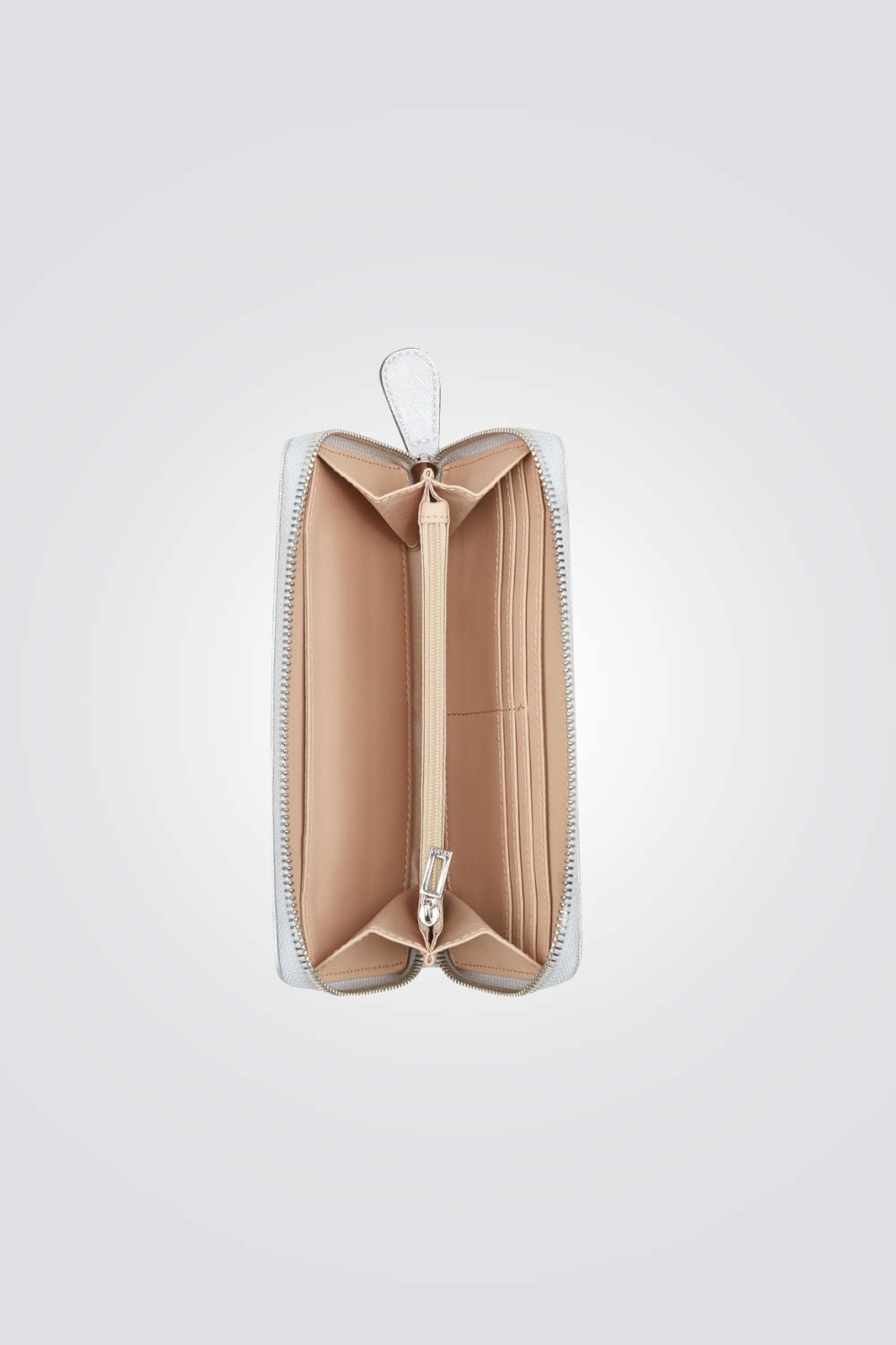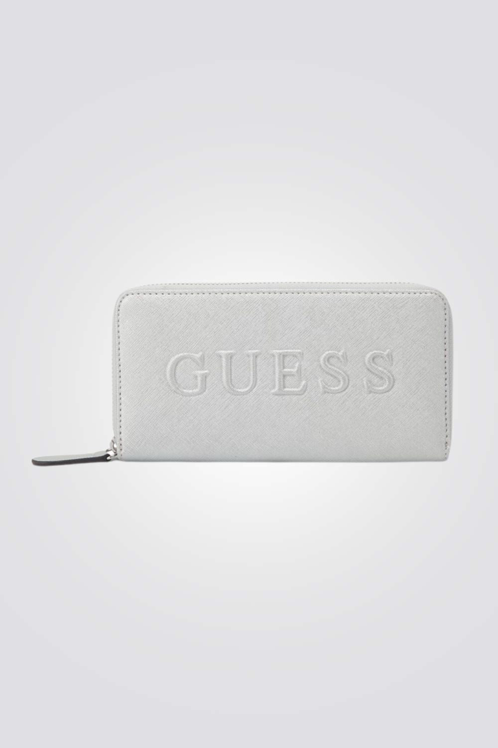 ארנק לנשים מבית המותג GUESS, בעיצוב קלאסי ועדין, בצבע כסף, תא רעשי עם סגירת רוכסן ,תא פנימי לכסף קטן ועוד תאים לכרטיסים.
