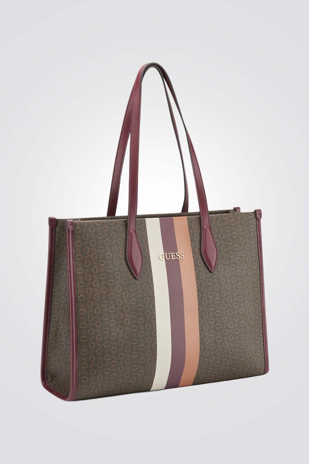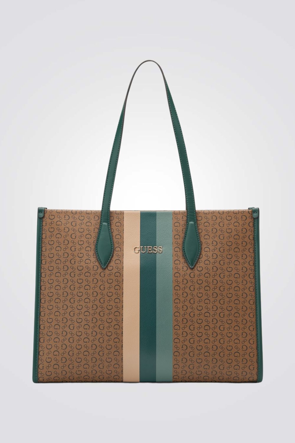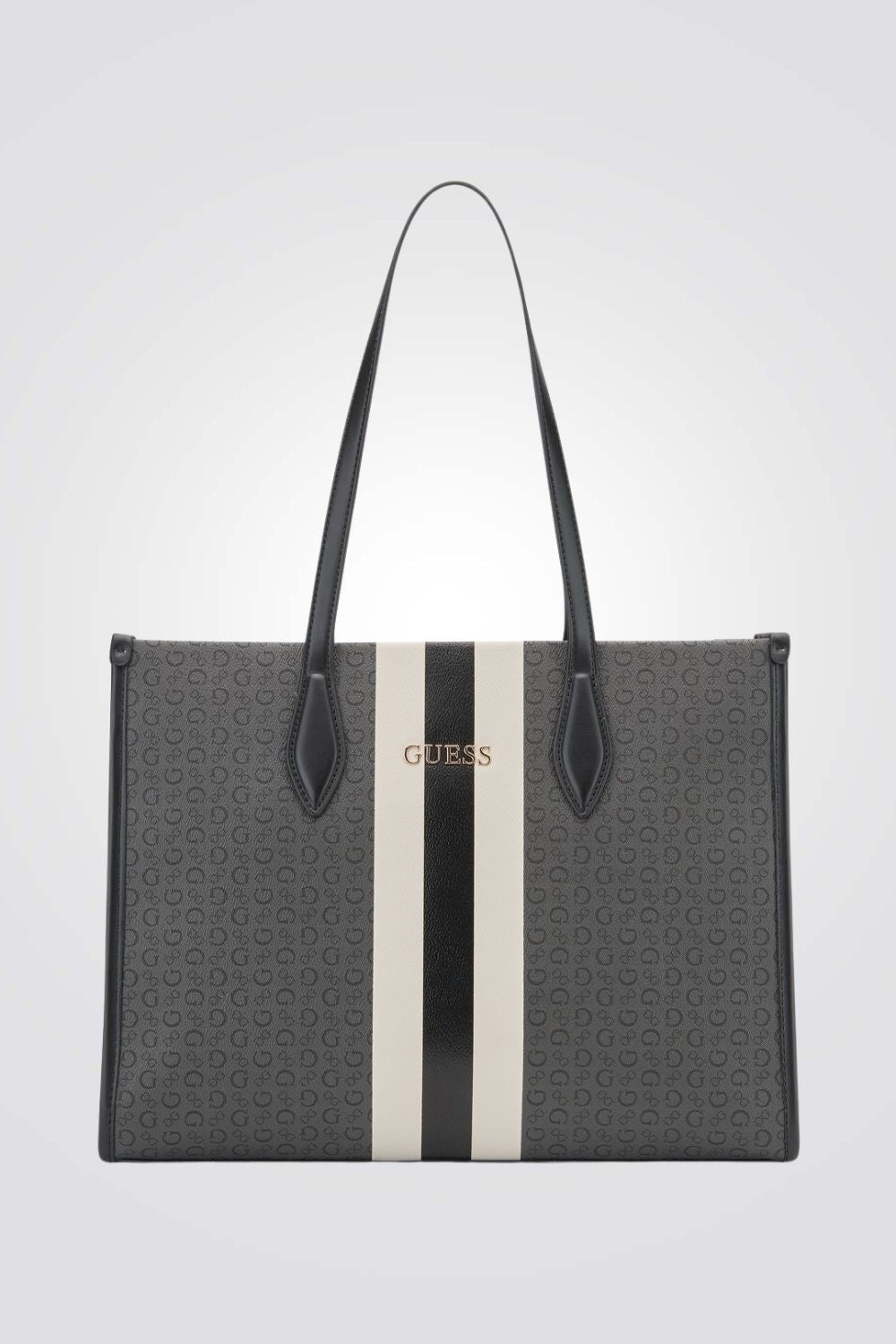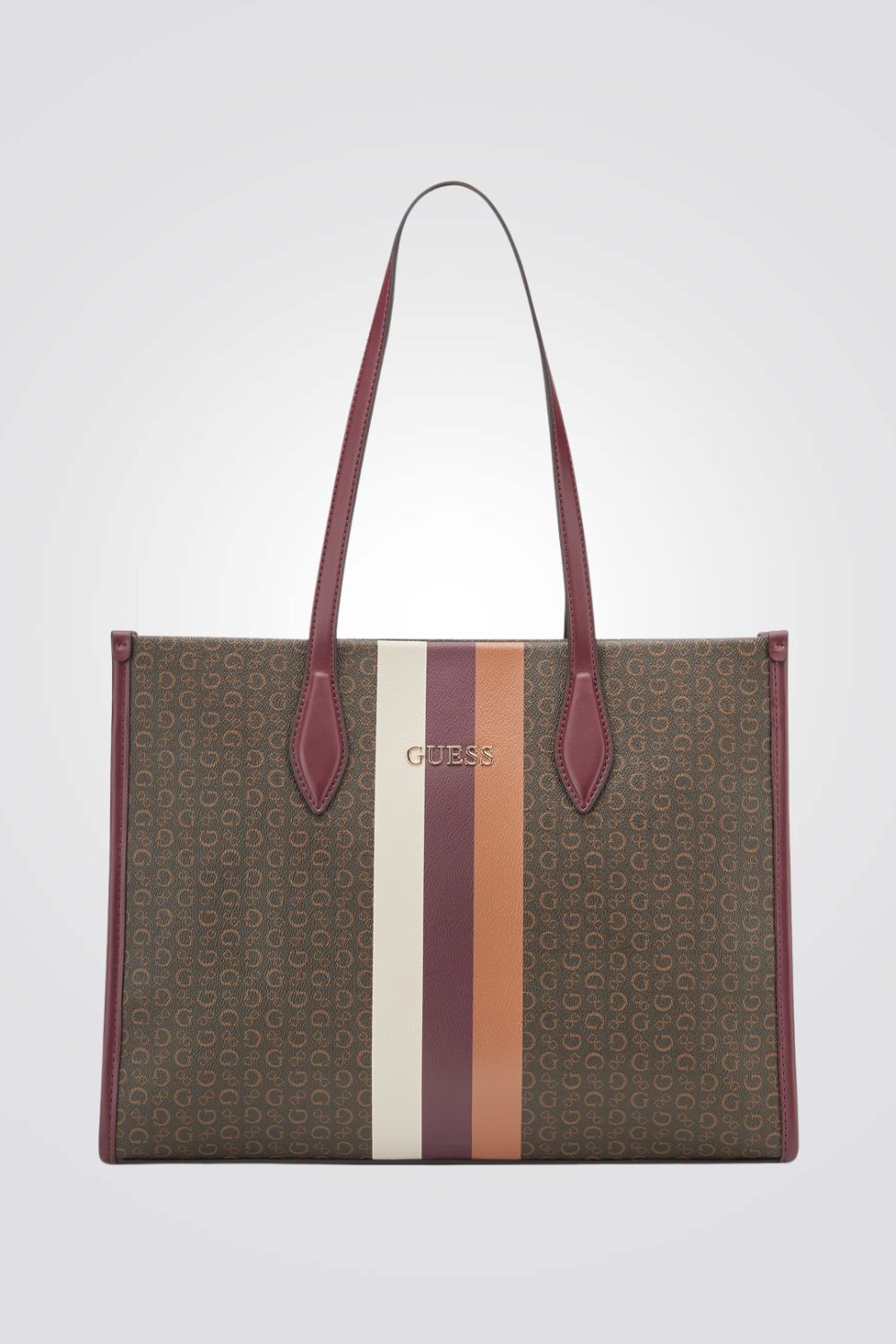תיק יד גדול מבית המותג GUESS בעל רצועות נשיאה קצרות, 3 תאי אחסון מרכזיים עם סגירת רוכסן והדפס פסים בקדמת התיק בצבעים שונים בשילוב לוגו המותג בחזית.