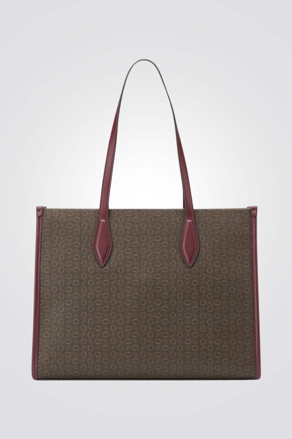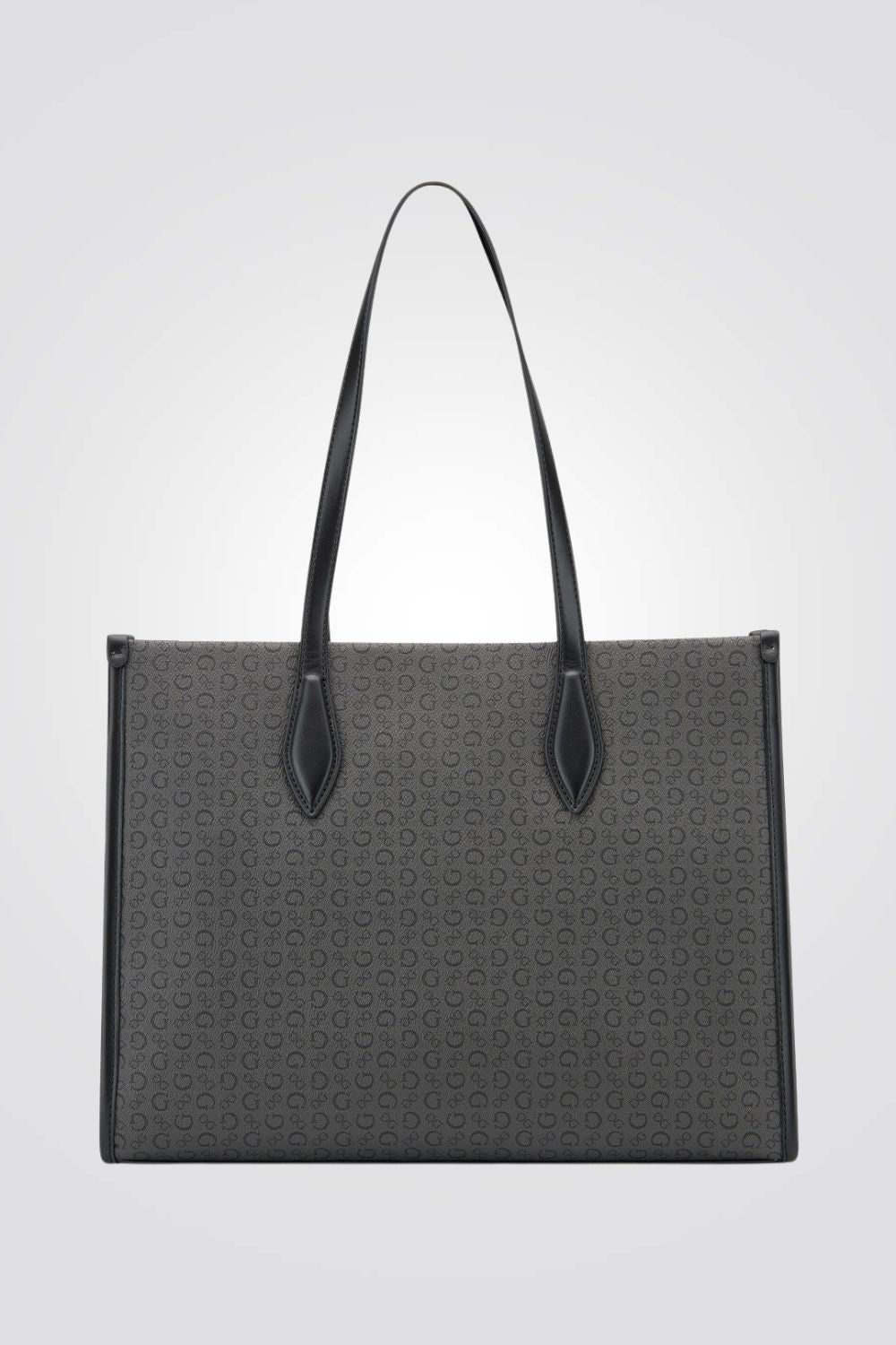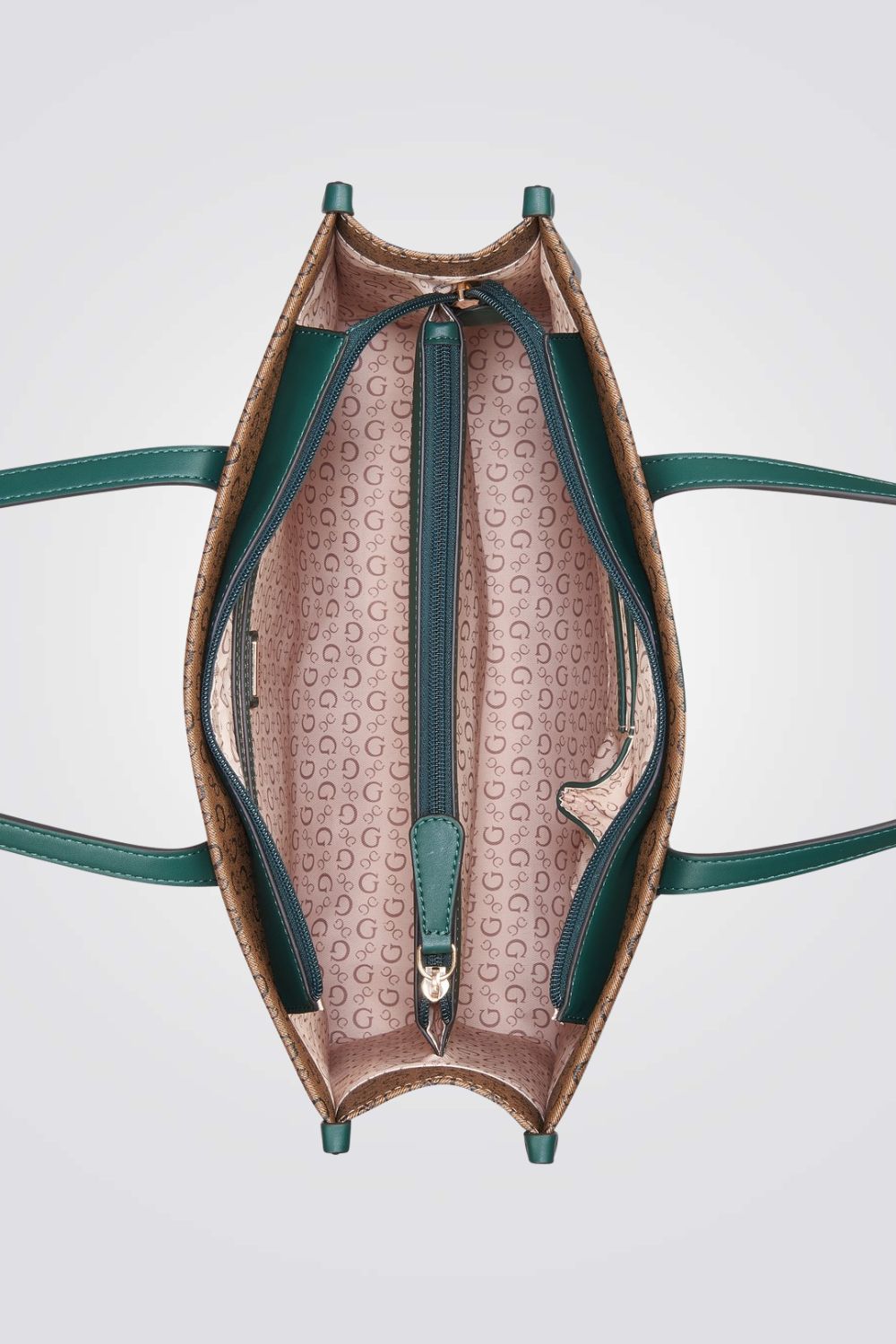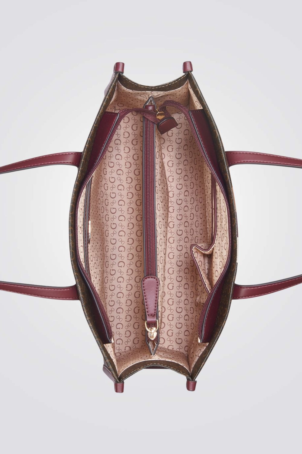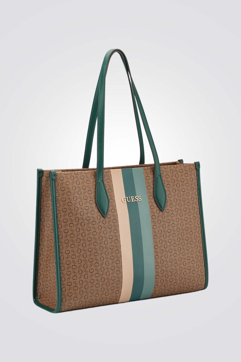תיק יד גדול מבית המותג GUESS בעל רצועות נשיאה קצרות, 3 תאי אחסון מרכזיים עם סגירת רוכסן והדפס פסים בקדמת התיק בצבעים שונים בשילוב לוגו המותג בחזית.