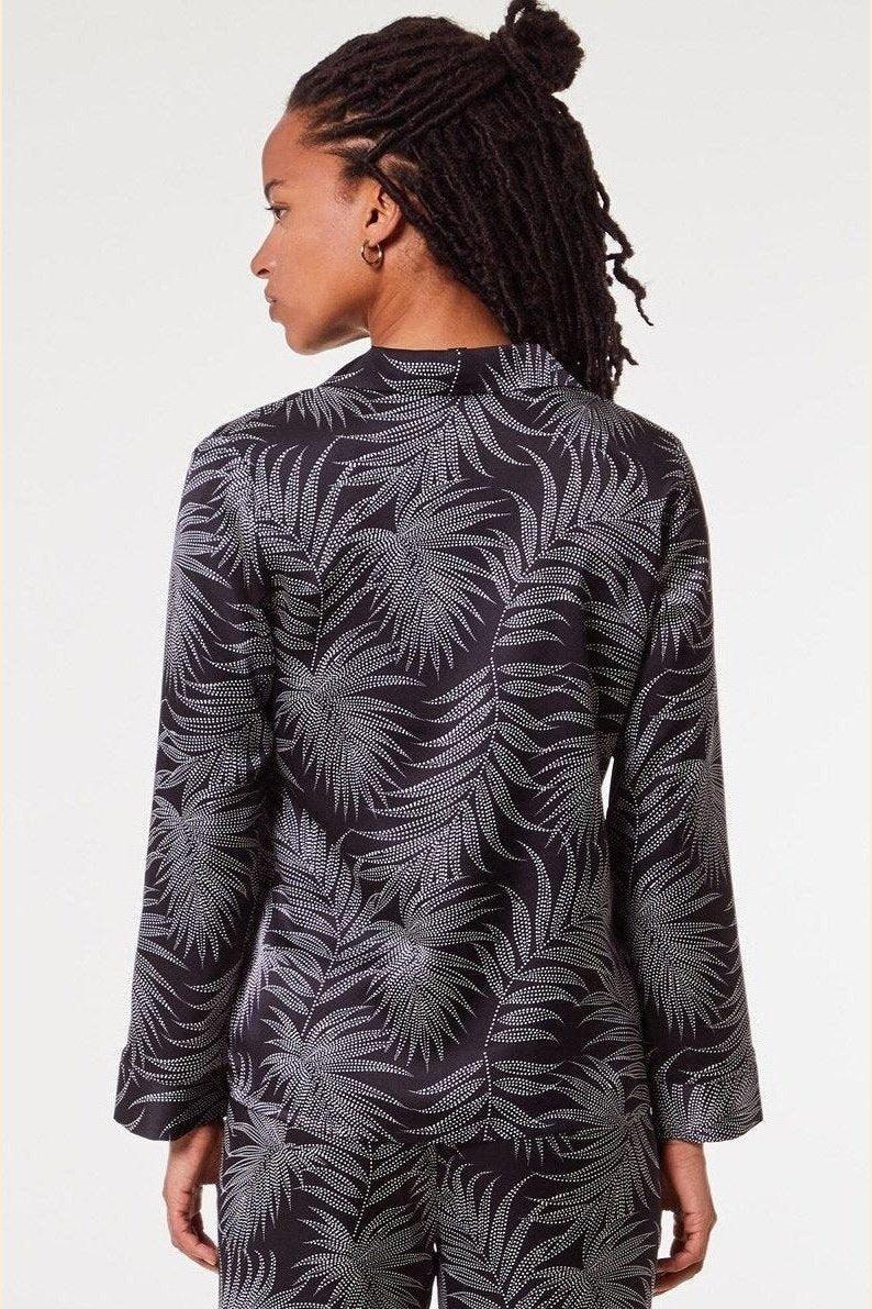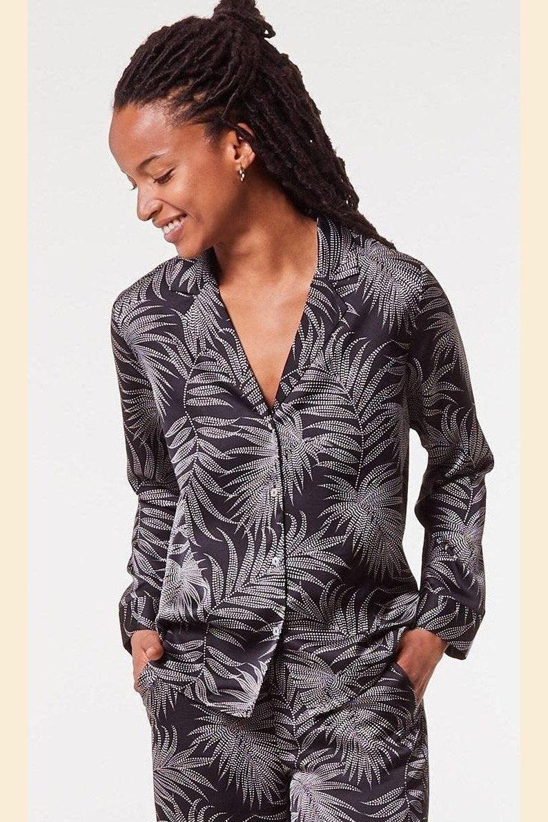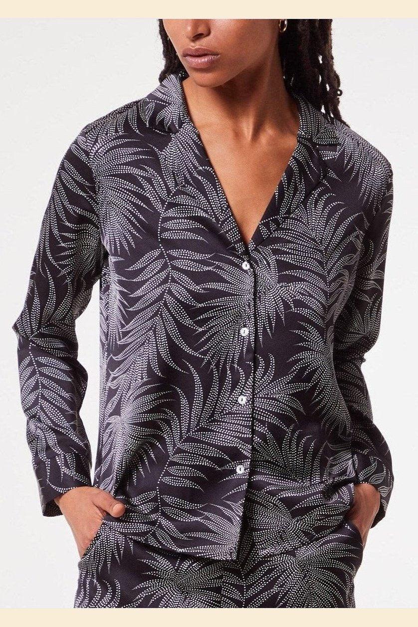 חולצת פיג'מה מבית המותג הצרפתי ETAM מבד סאטן דק ונעים, בצבע שחור עם הדפס דוגמת עלים. חולצה עם שרוולים ארוכים, צווארון קלאסי וסגירת כפתורים קדמית.
