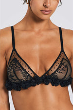 חזיית תחרה מיוחדת מבית המותג הצרפתי ETAM, ללא ריפוד, בעלת כתפיות מתכווננות ומעוטרת עם טול שקוף מנוקד, תחרה פרחונית ומלמלה באיזור קו החזה.
